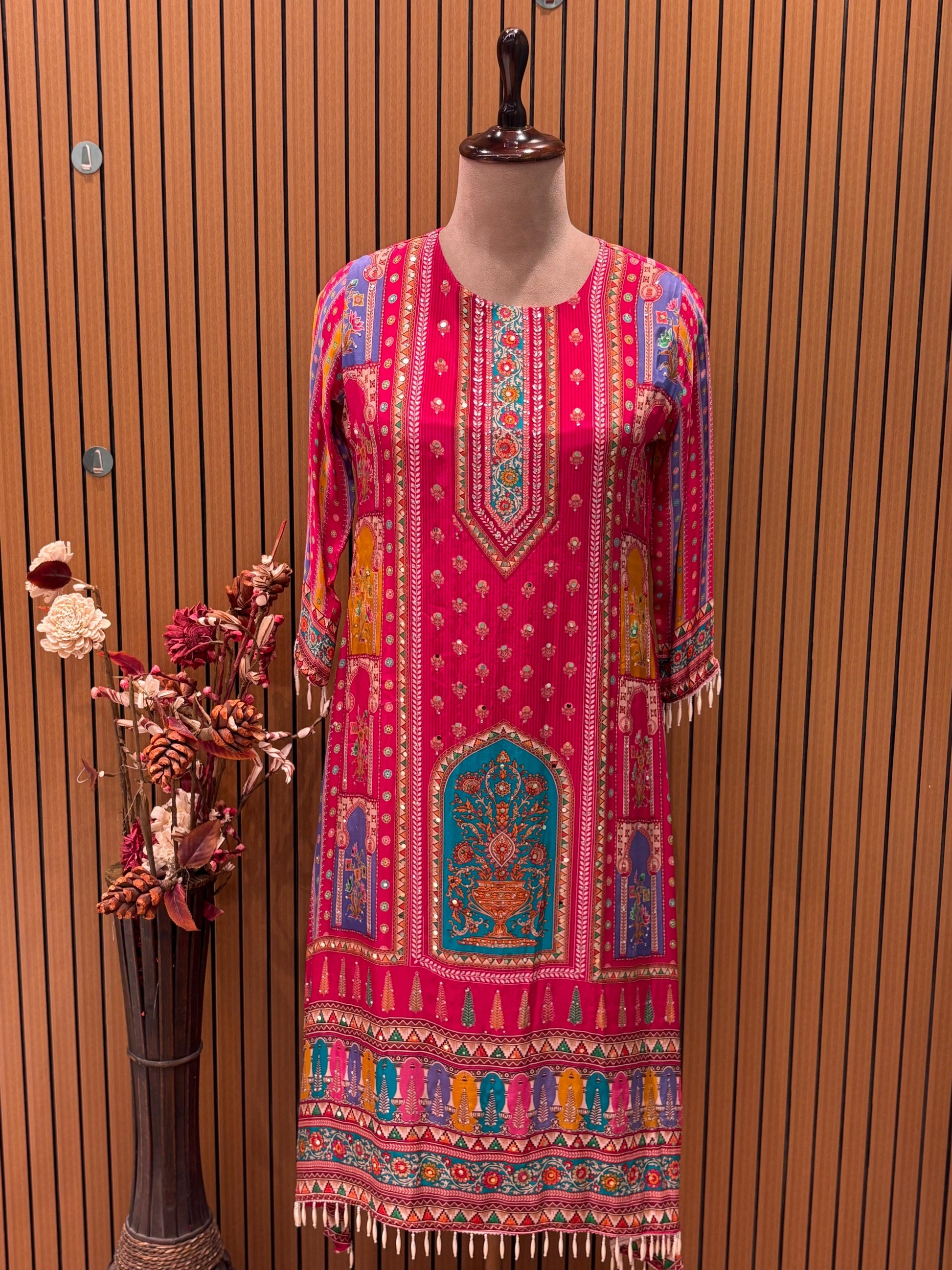 Brighten your wardrobe with this vibrant pink printed kurti, featuring temple motifs, traditional art, and playful tassel detailing—perfect for festive flair and everyday elegance.
