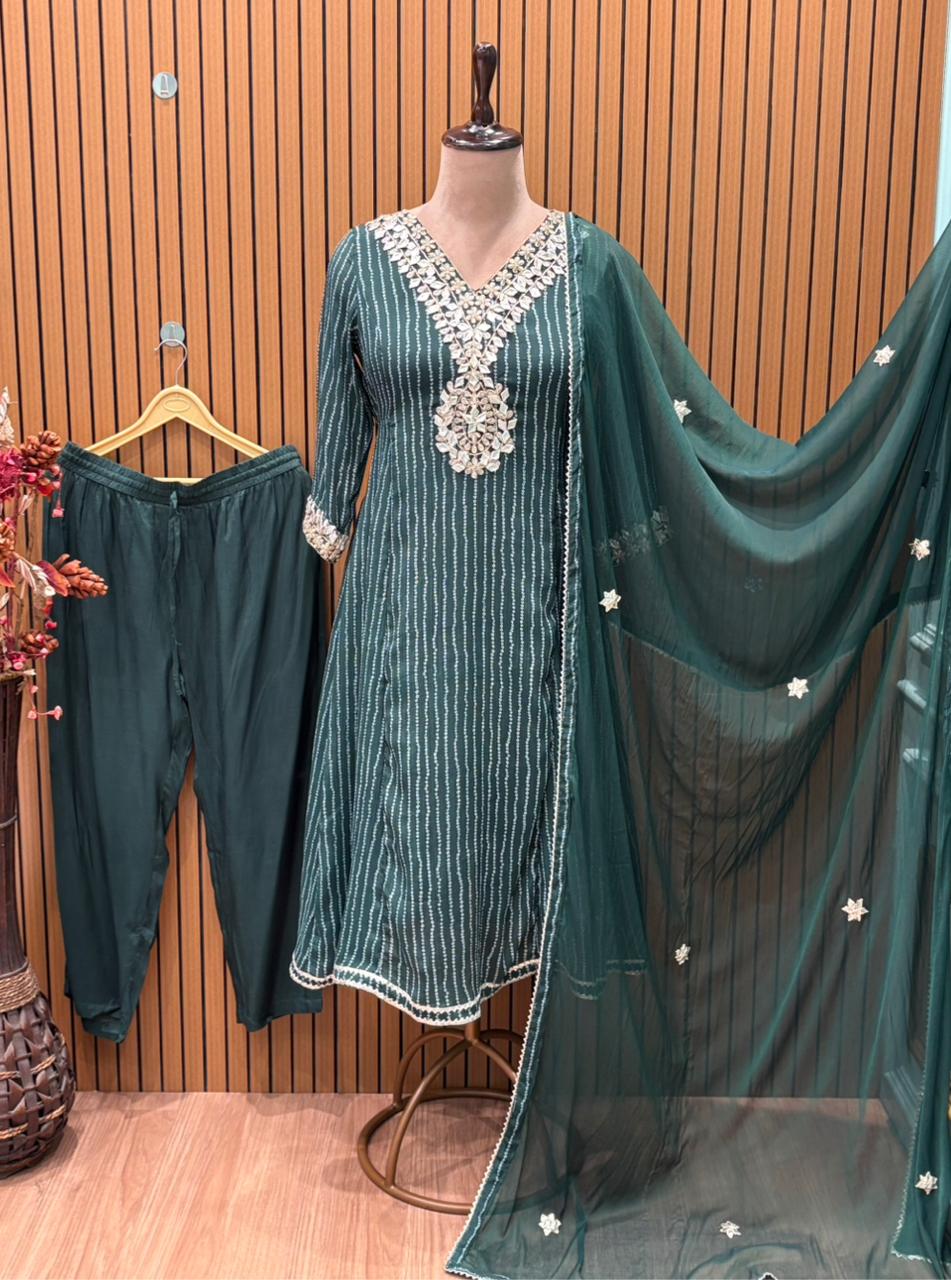 Elegant Chinon Anarkali suit set in deep green, gota Patti