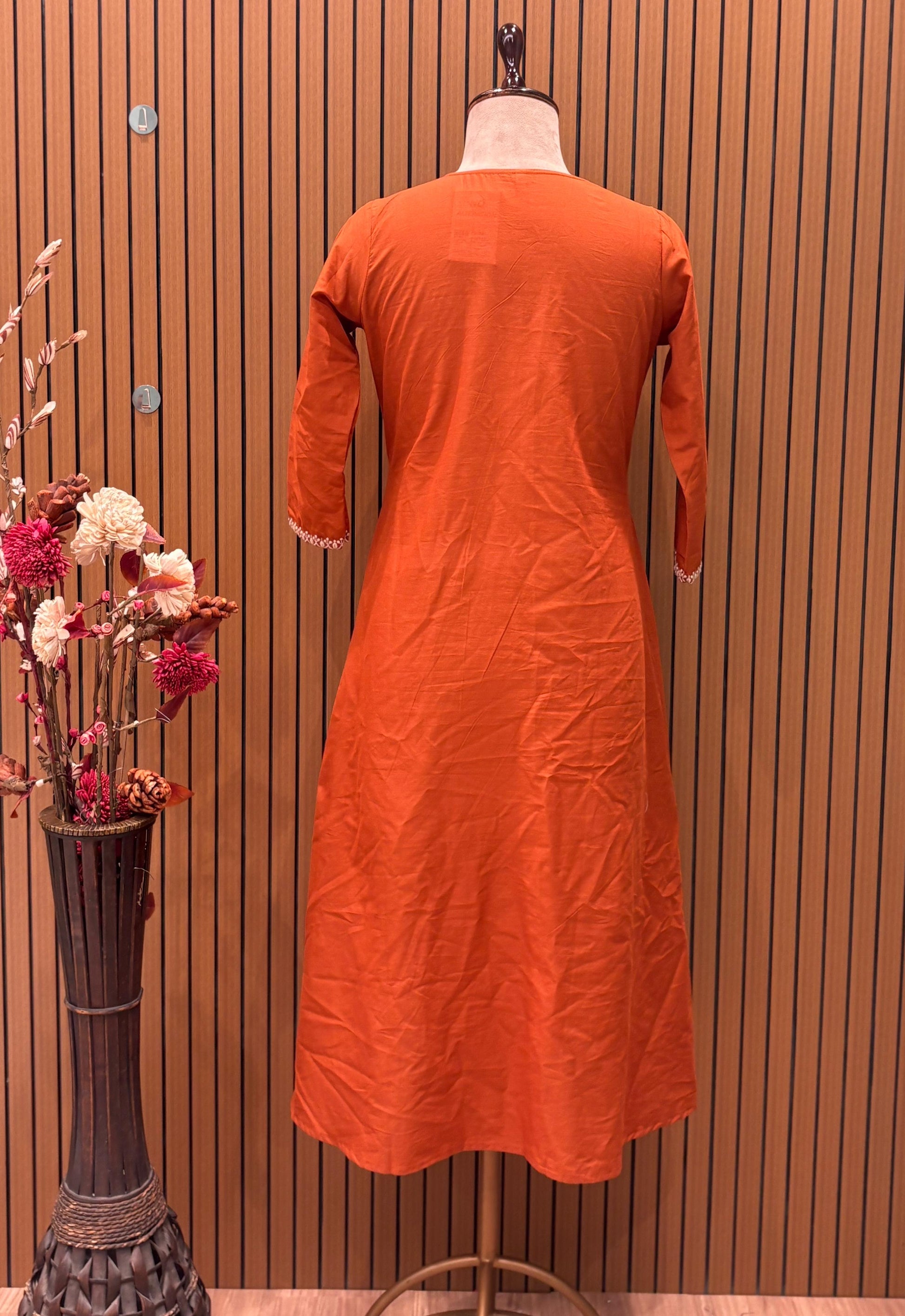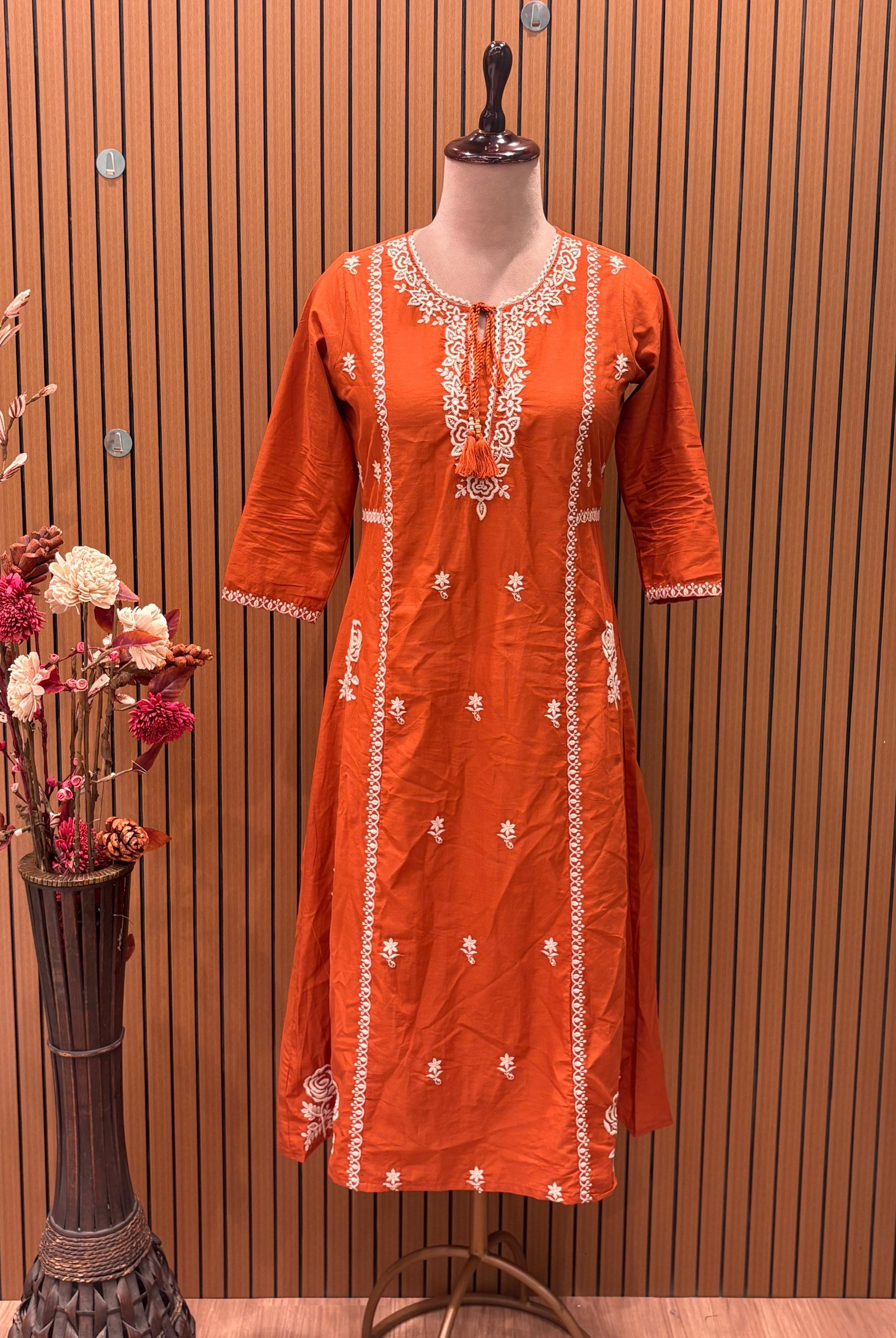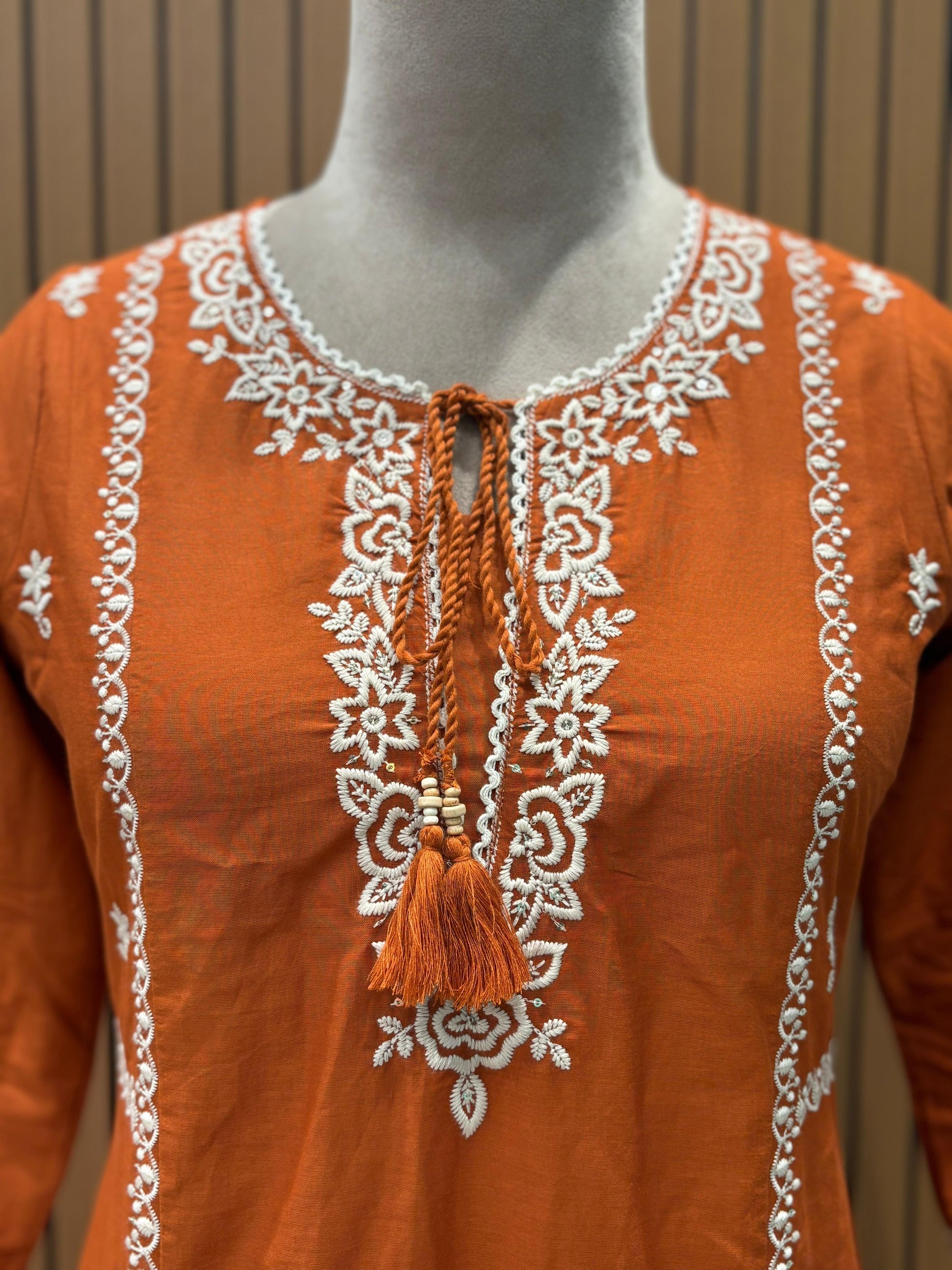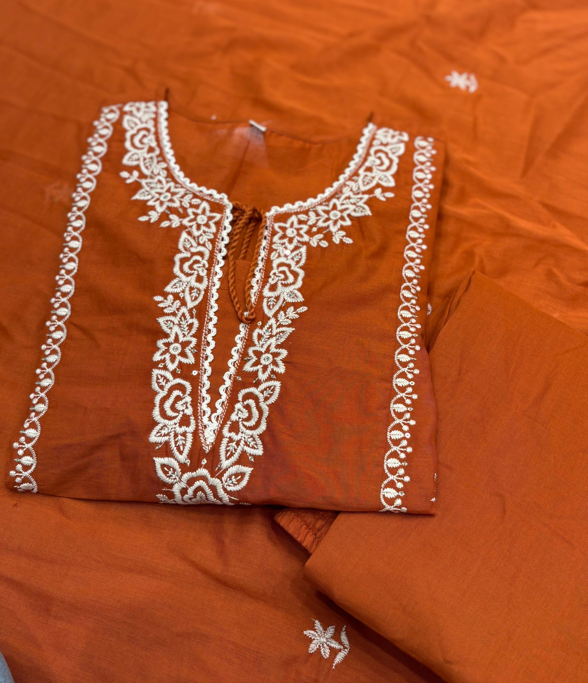 This stunning rust orange cotton suit features delicate white thread embroidery on the neckline and sleeves. The set includes straight pants and a matching dupatta adorned with minimal floral motifs—ideal for festive or casual elegance.