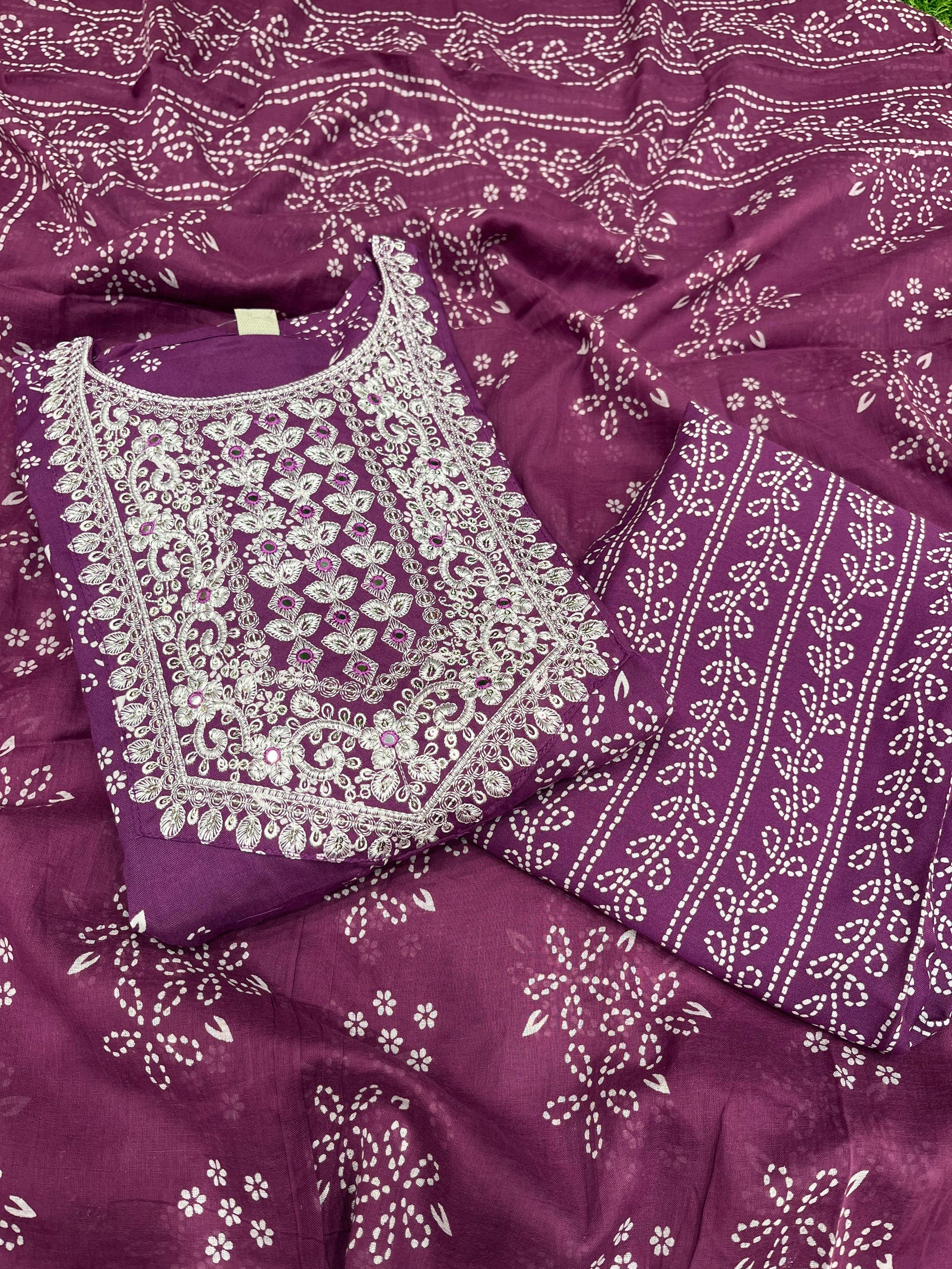 This vibrant purple ethnic set showcases intricate white thread embroidery on the kurta, complemented by a printed salwar and matching dupatta—perfect for festive gatherings and traditional occasions.