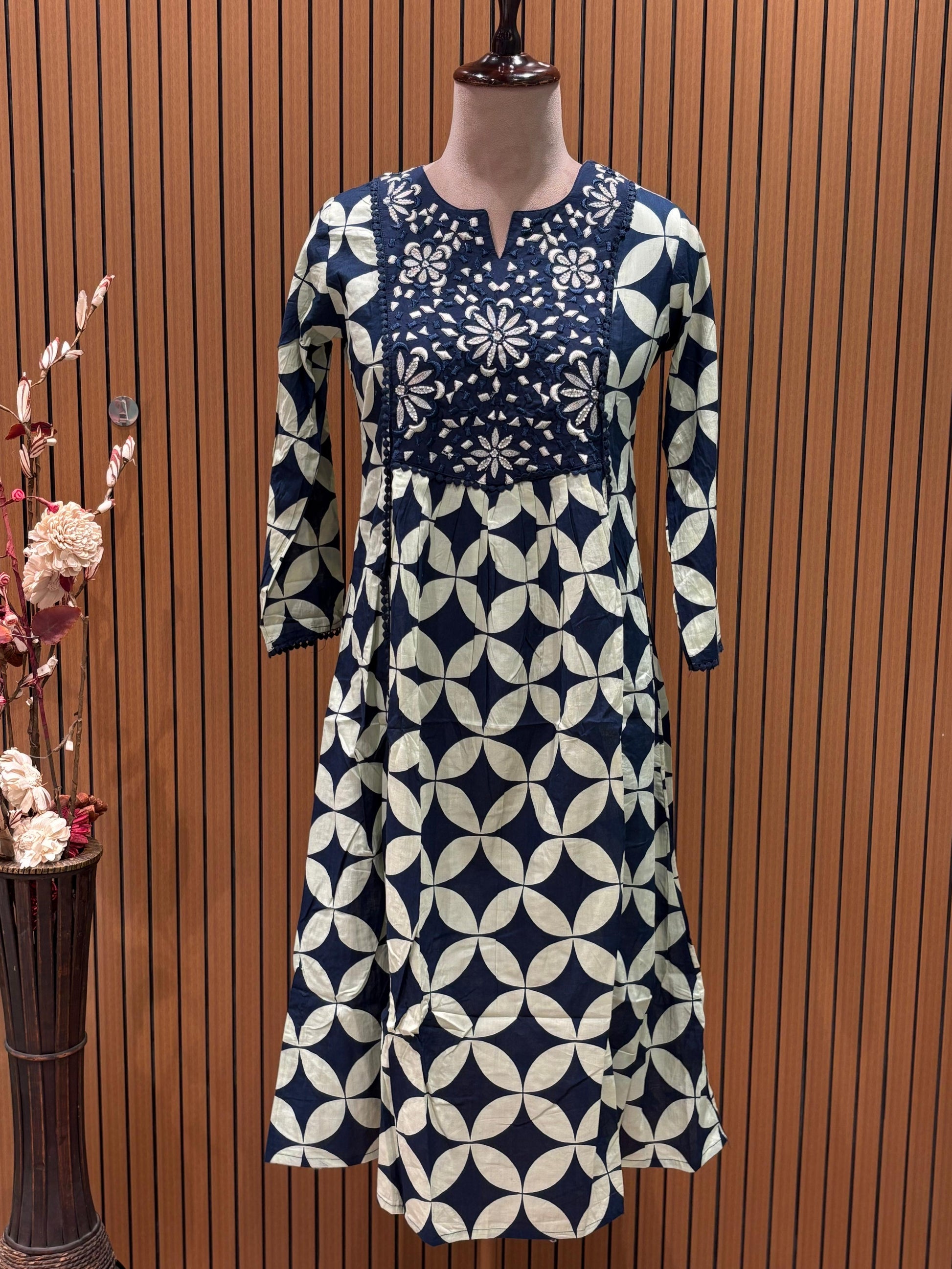 This elegant navy blue and cream suit set is a statement in timeless prints and contrast—featuring bold geometric and floral patterns on the kurta and dupatta, paired with solid navy pants for a chic, modern ethnic vibe.