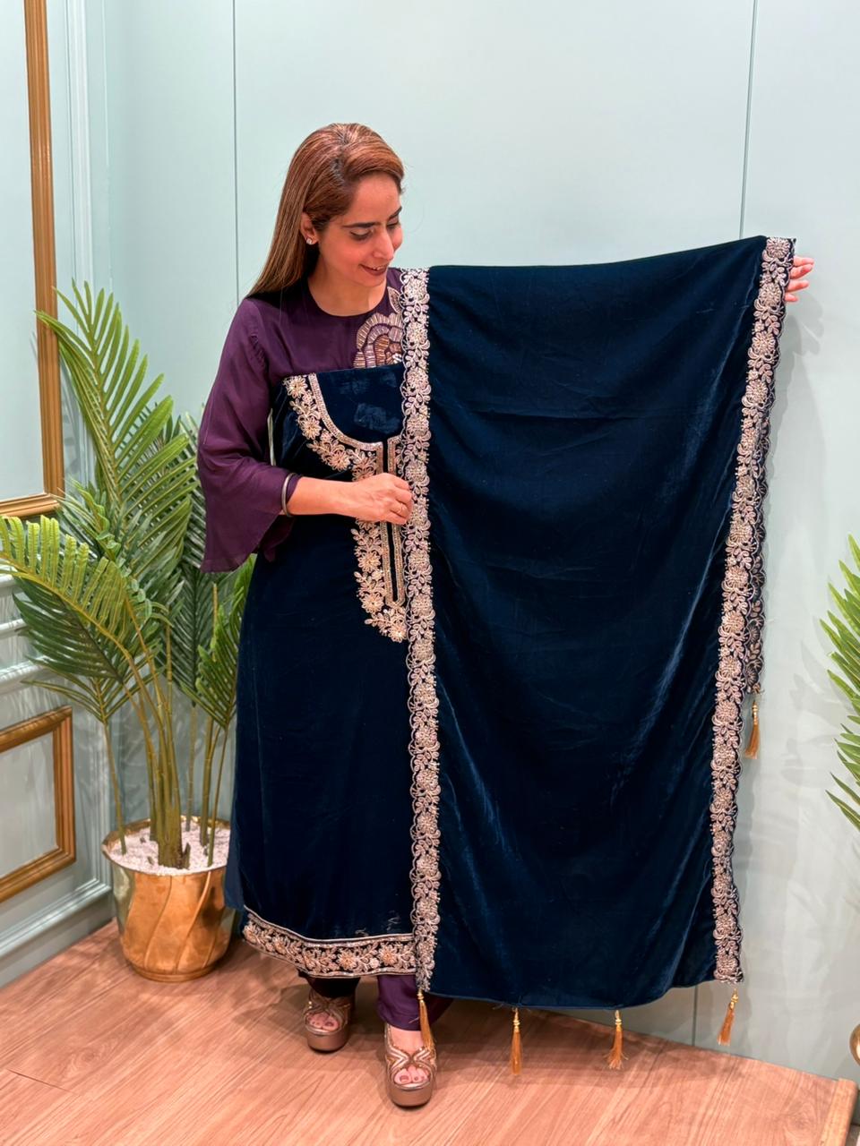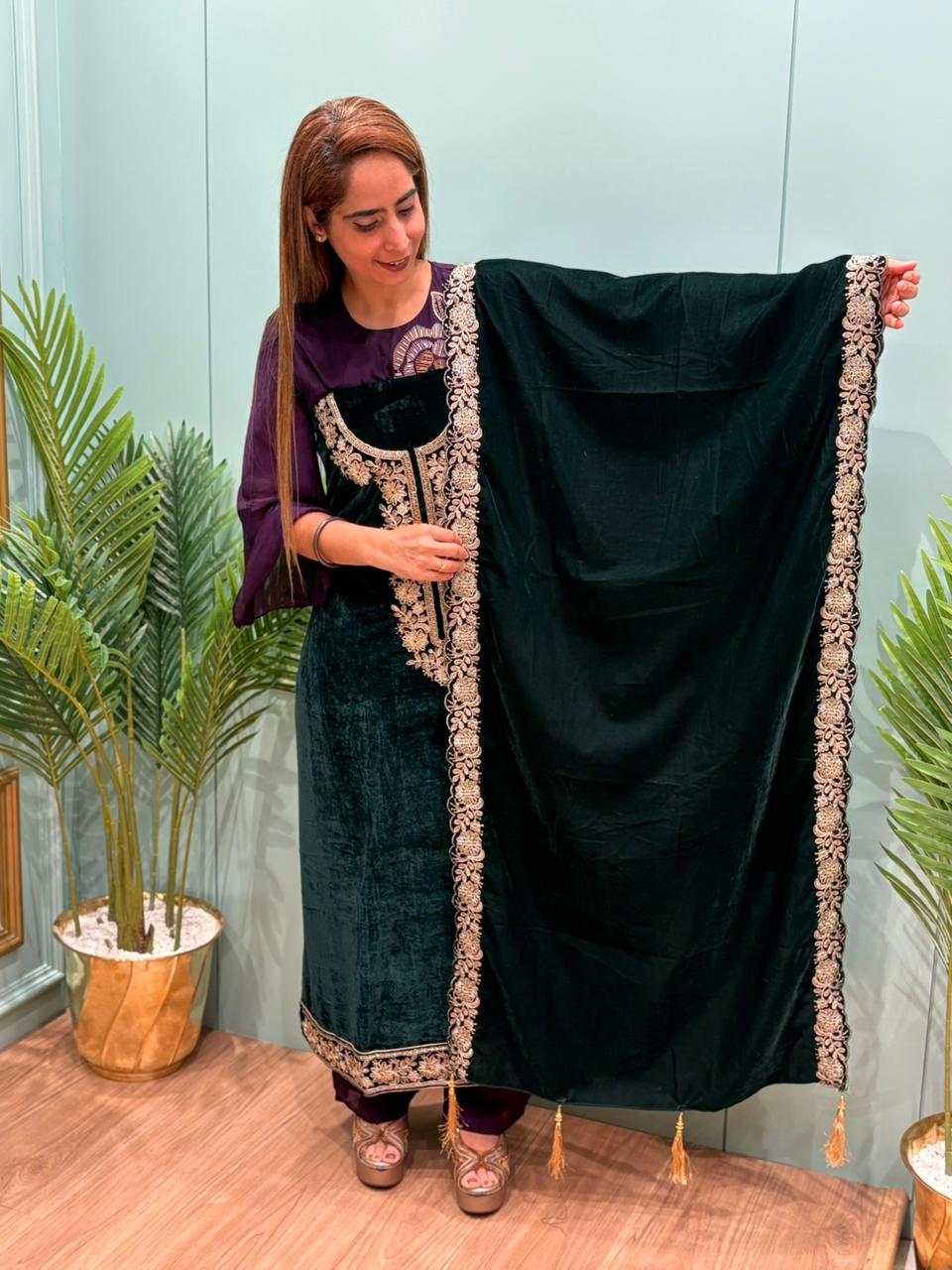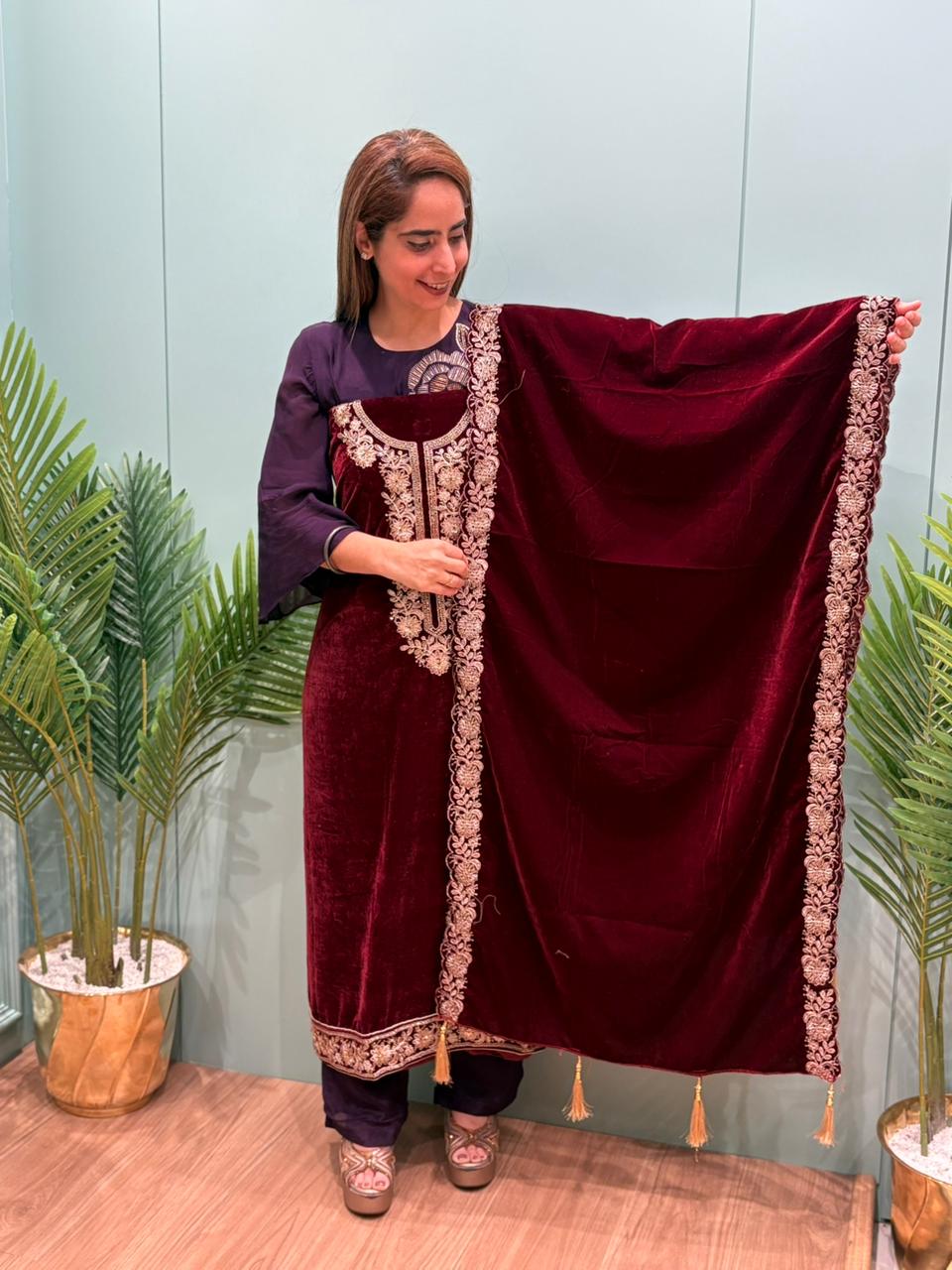 Presenting our luxurious unstitched velvet suit collection – detailed embroidery on the kameez, rich velvet dupatta with elegant cutwork border, and matching velvet bottom for a complete regal look.