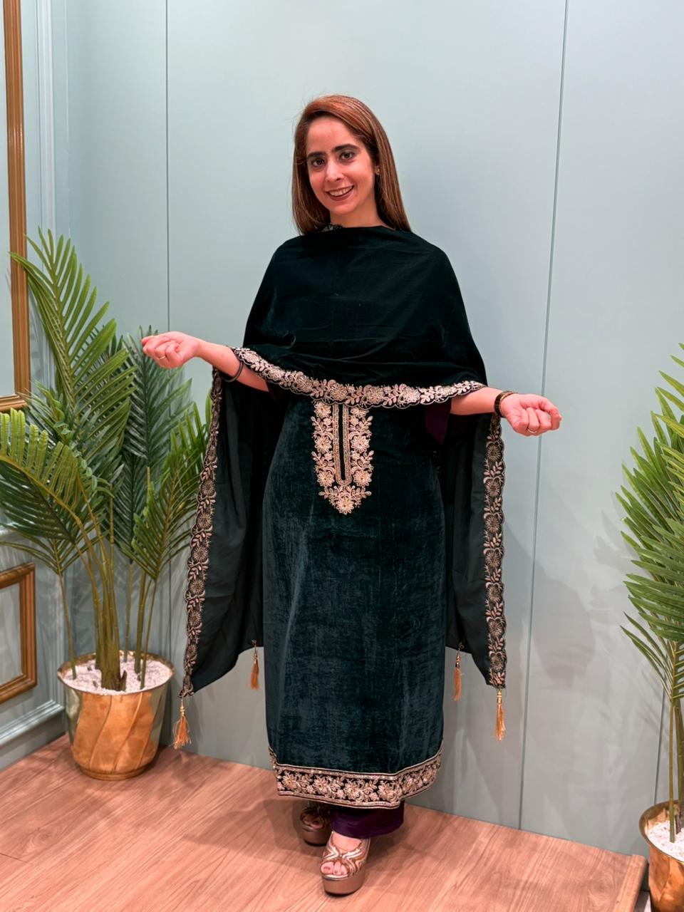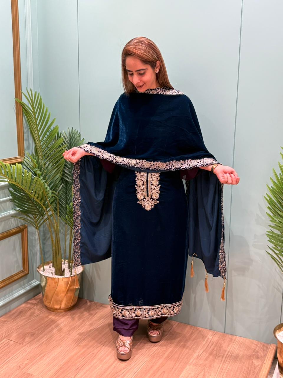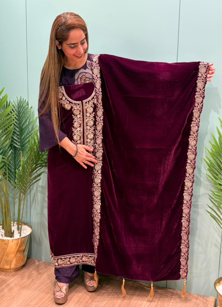 Presenting our luxurious unstitched velvet suit collection – detailed embroidery on the kameez, rich velvet dupatta with elegant cutwork border, and matching velvet bottom for a complete regal look.