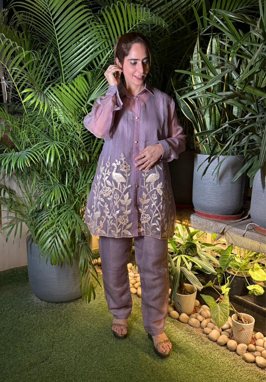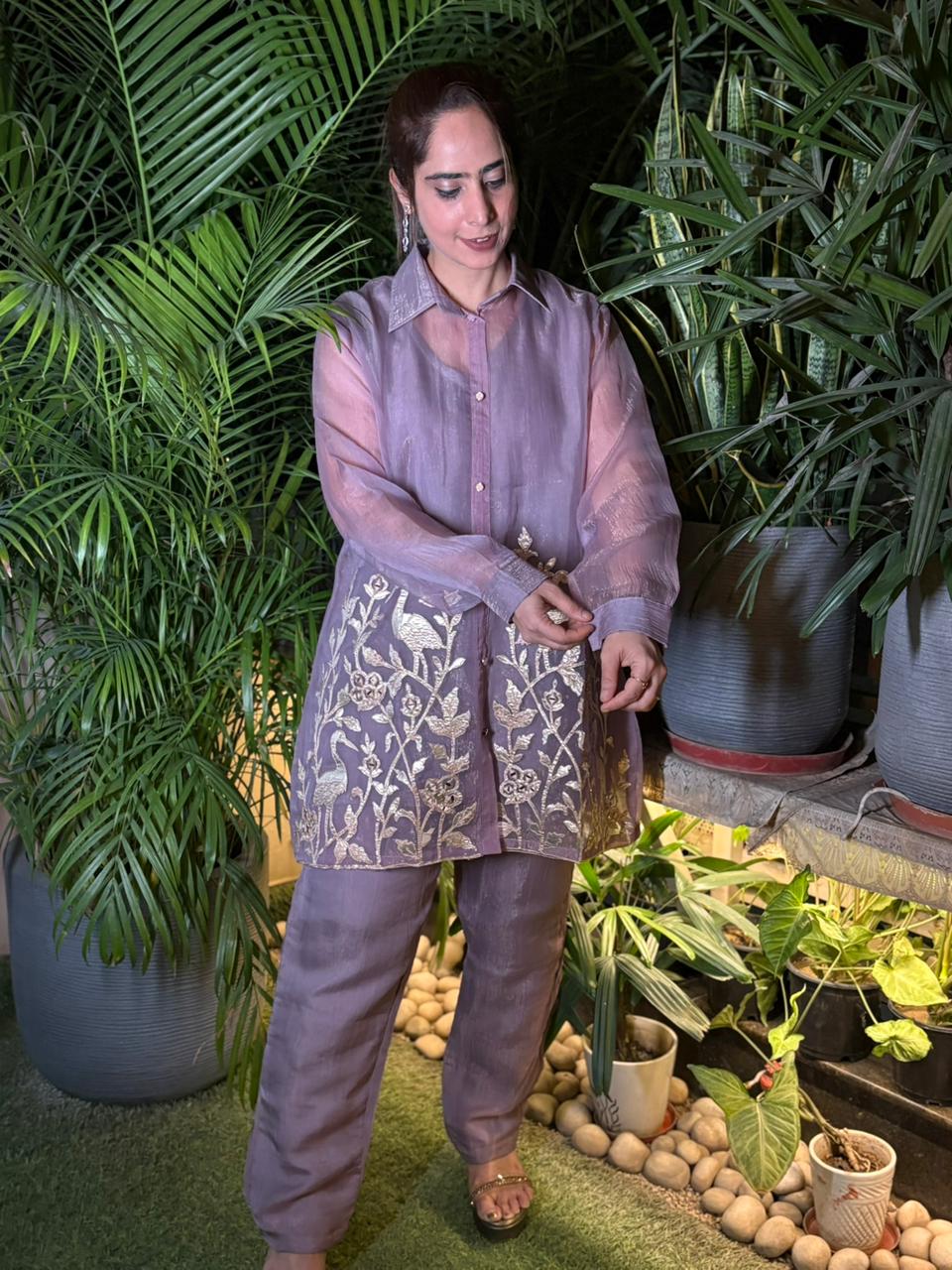 A graceful cord set crafted in luxurious tissue shimmer fabric, designed to bring effortless elegance to your wardrobe. The shirt features delicate detailing that beautifully highlights the silhouette, giving the outfit a soft festive glow while remaining comfortable and sophisticated. Paired with matching pants, this ensemble creates a polished yet modern look perfect for brunch gatherings, evening get-togethers, or festive celebrations