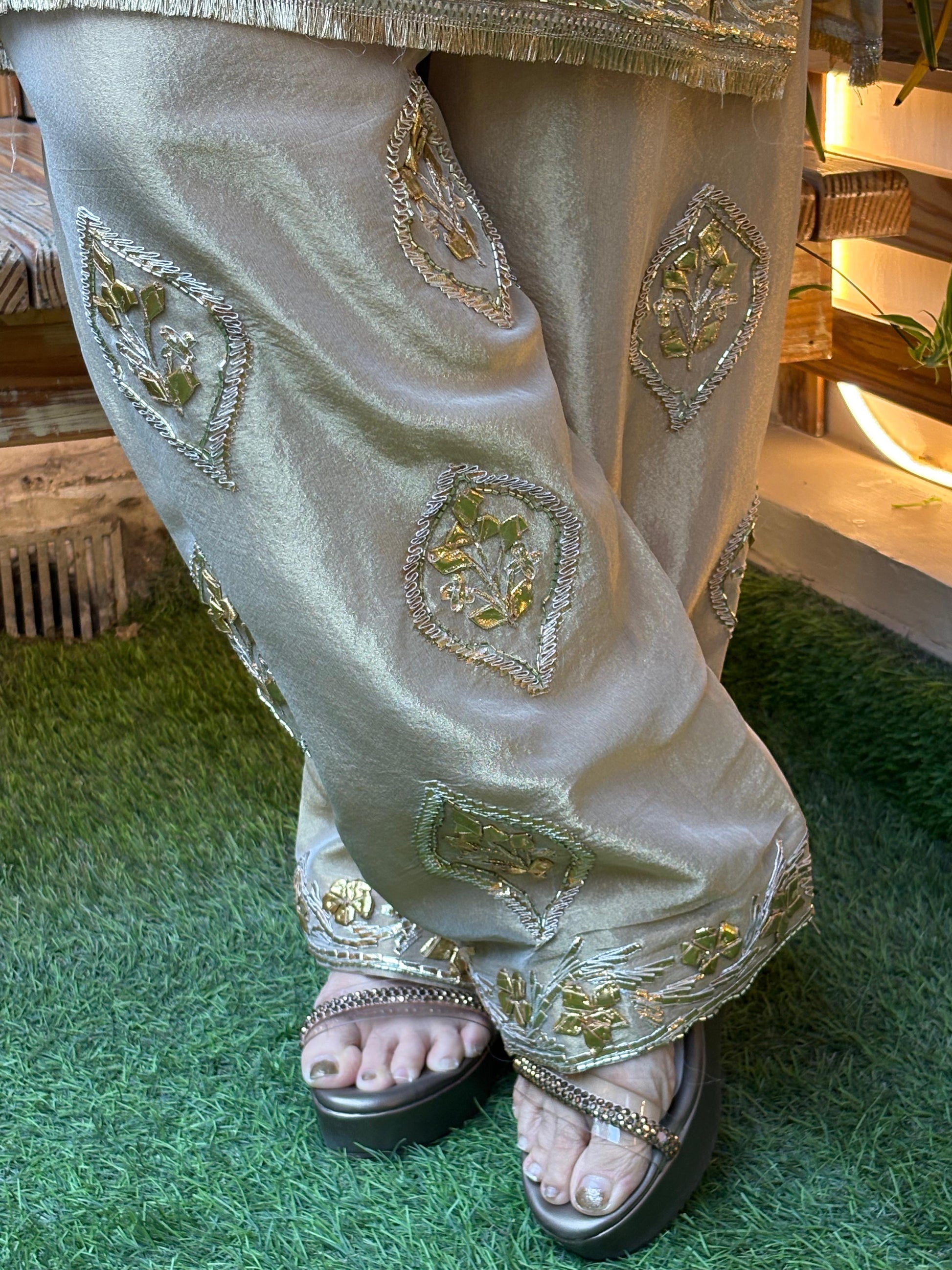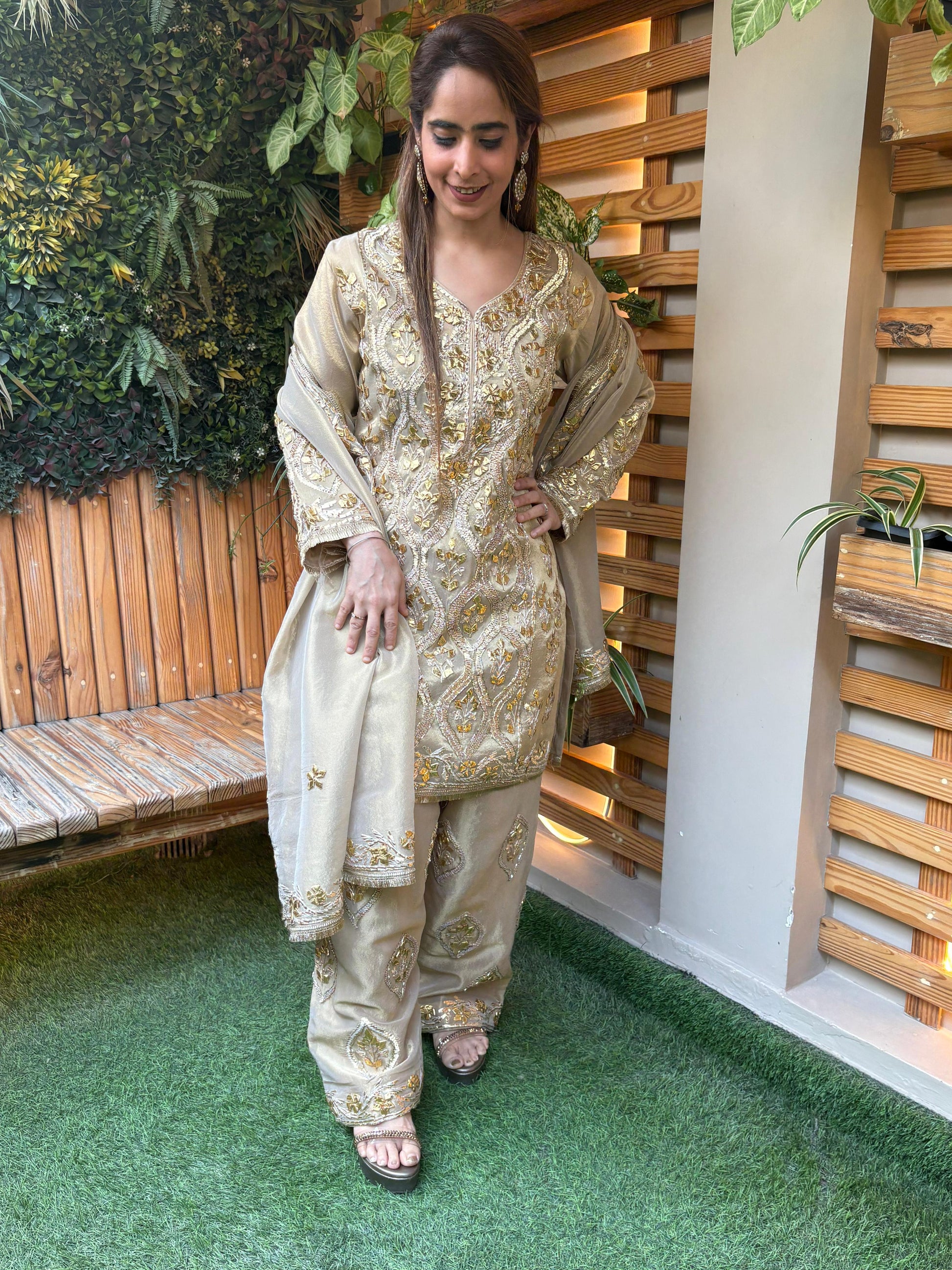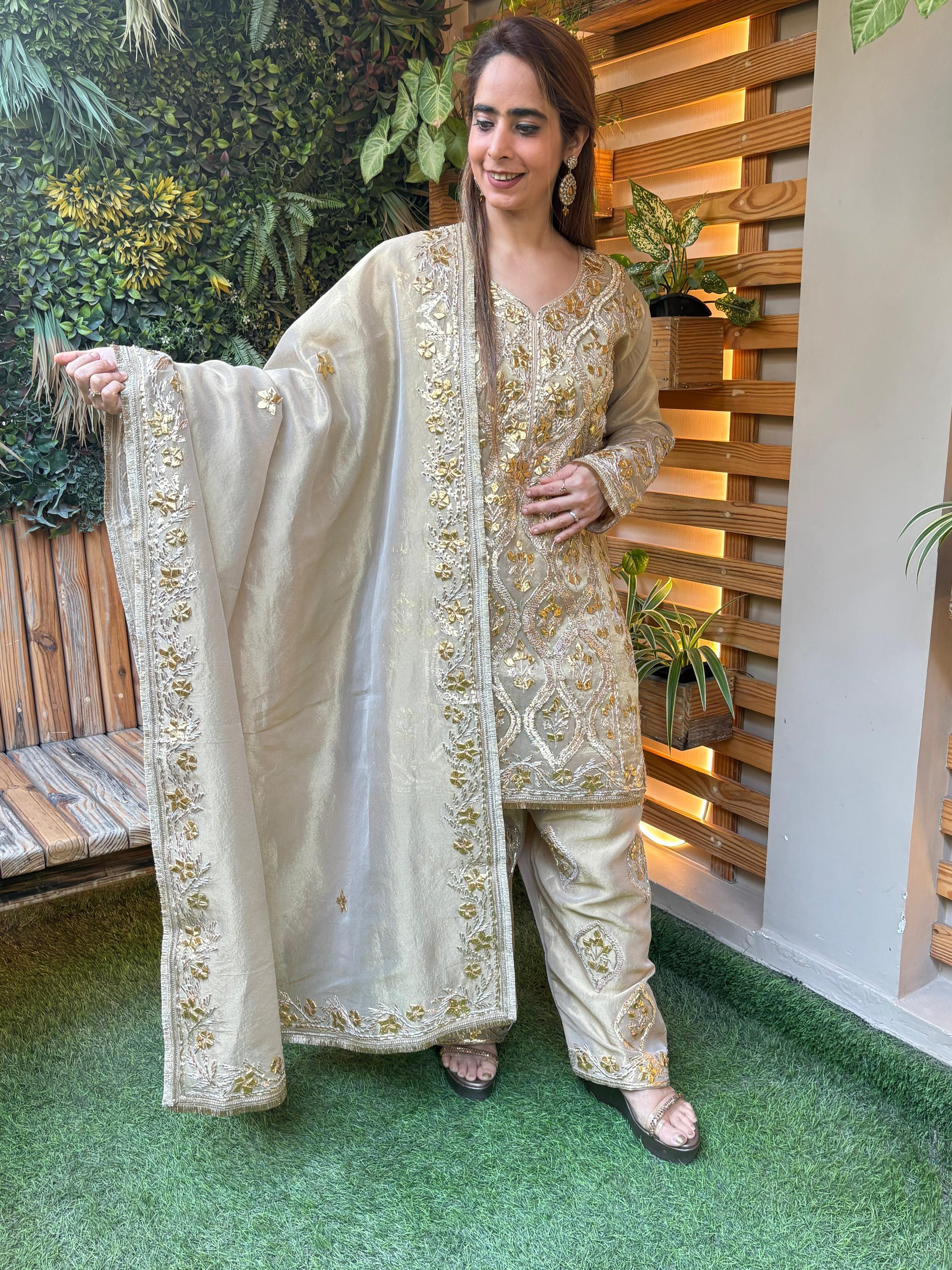 This graceful kurta set is crafted in premium shimmer organza fabric, offering a soft sheen and an effortlessly elegant look. The kurta is beautifully enhanced with intricate gota work, adding a touch of traditional richness while keeping the design light and sophisticated. Paired with matching bottoms featuring subtle detailing, the ensemble creates a balanced and polished silhouette. The shimmer organza dupatta flows delicately, completing the look with understated charm. Perfect for festive occasions, intimate wedding functions, family celebrations, and evening gatherings, this kurta set blends classic craftsmanship with modern elegance—ideal for women who love timeless style with a graceful sparkle.