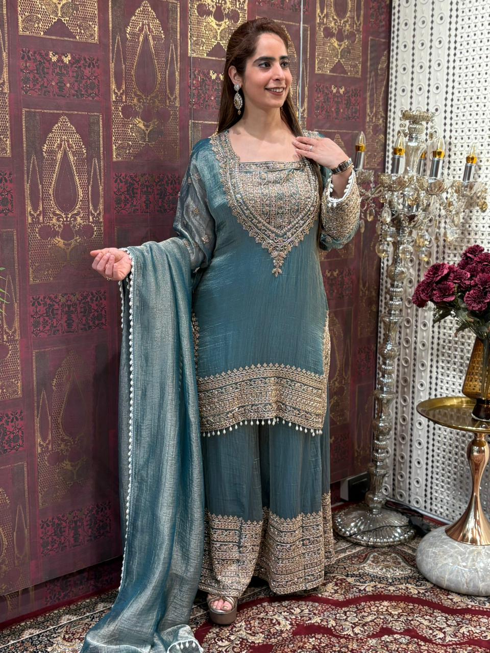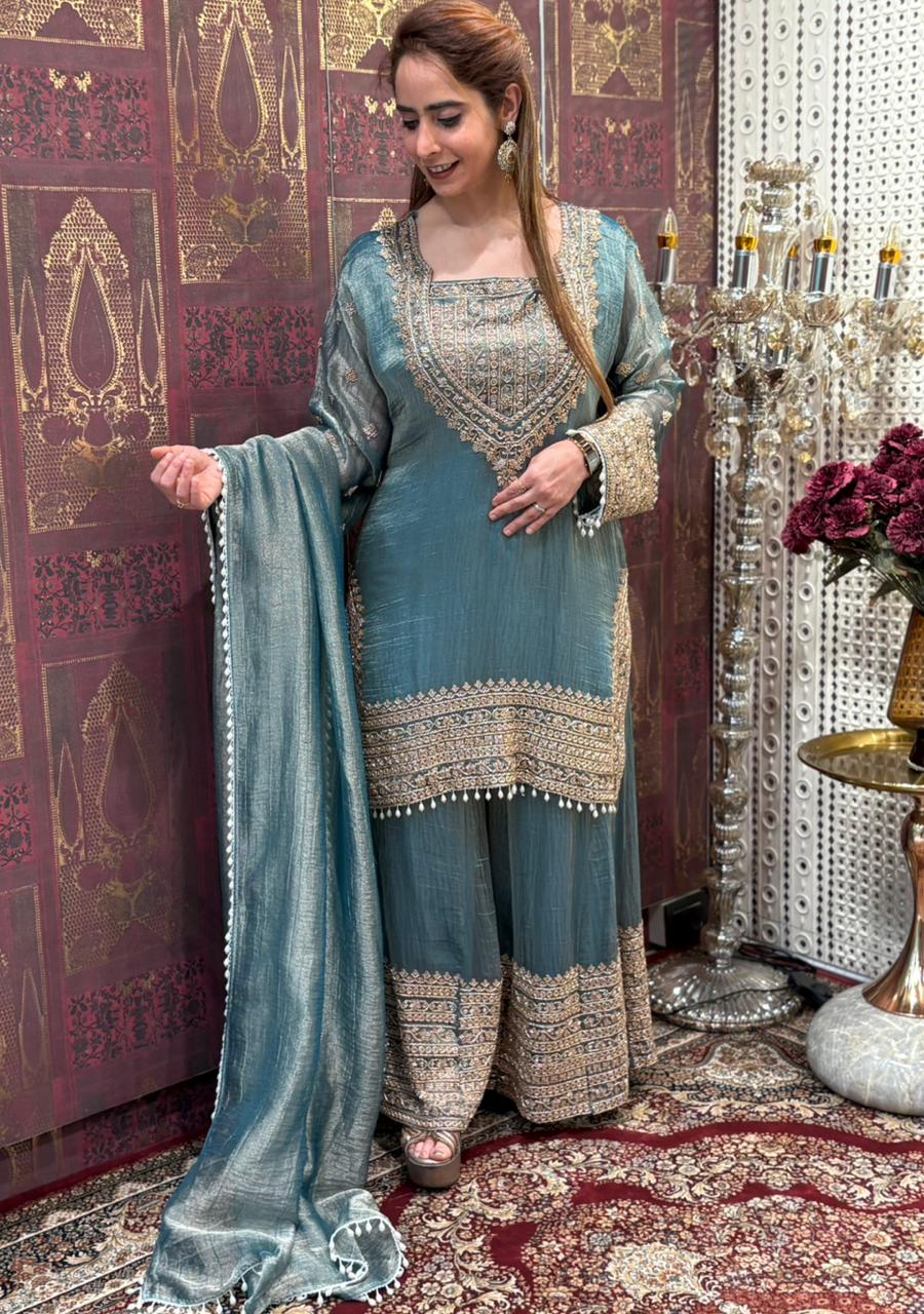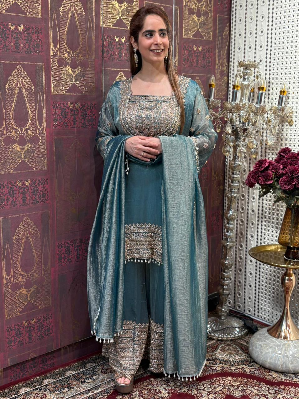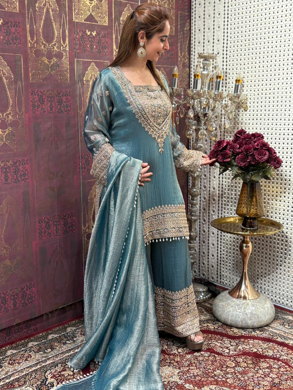 Elevate your festive wardrobe with this stunning tissue shimmer kurta set designed for graceful celebrations. The kurta is beautifully adorned with intricate cut dana work on the neckline and detailed borders, adding a rich handcrafted charm. The matching plazo features coordinated embellishments that enhance the overall elegance of the outfit. A lightweight dupatta completes the look, finished with delicate tassel detailing for that perfect festive movement. The subtle sheen of the fabric gives a luxurious glow, making it ideal for weddings, parties, and special gatherings. Available in three regal shades – Royal Mustard Gold, Midnight Olive Green, and Ocean Teal ✨