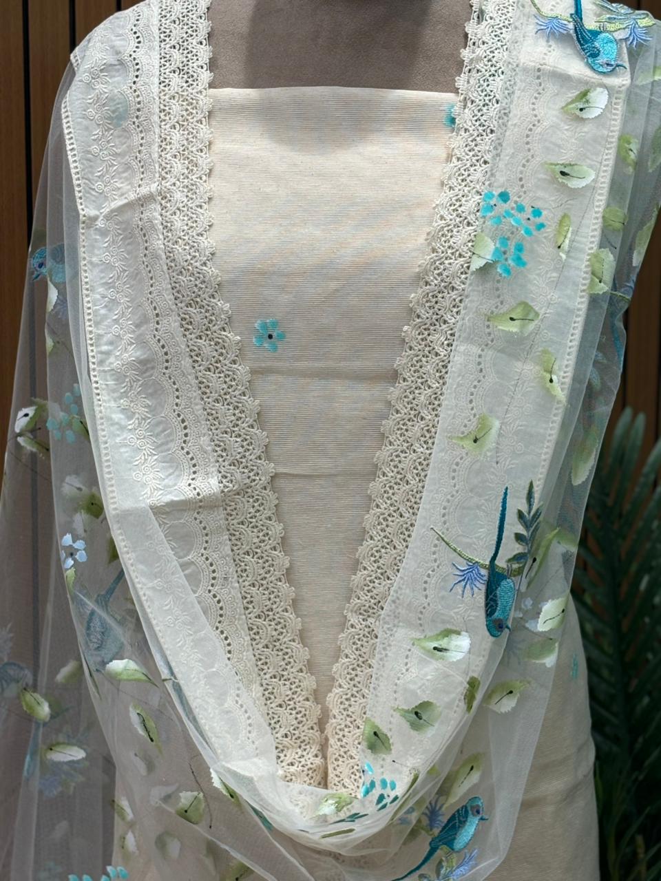 This graceful unstitched suit set is crafted in soft Kota cotton fabric, designed for comfort with a refined, elegant appeal. The shirt features a beautiful print enhanced with delicate lace work, adding a subtle charm that feels light yet detailed. The matching dupatta is equally stunning, highlighted with coordinated prints and fine lace finishing that elevates the overall look effortlessly. Paired with a comfortable cotton bottom fabric, this set is perfect for everyday elegance, daytime gatherings, office wear, and relaxed festive moments. Easy to style and soothing to wear, this unstitched Kota cotton suit is a beautiful blend of comfort, craftsmanship, and timeless simplicity.