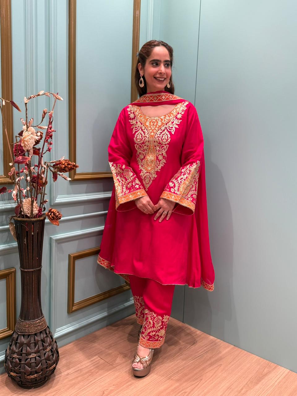 Radiate festive charm in our raw silk kurti set with organza dupatta, featuring intricate pitta zari and sequin neckline, perfect for graceful celebrations and timeless ethnic elegance.