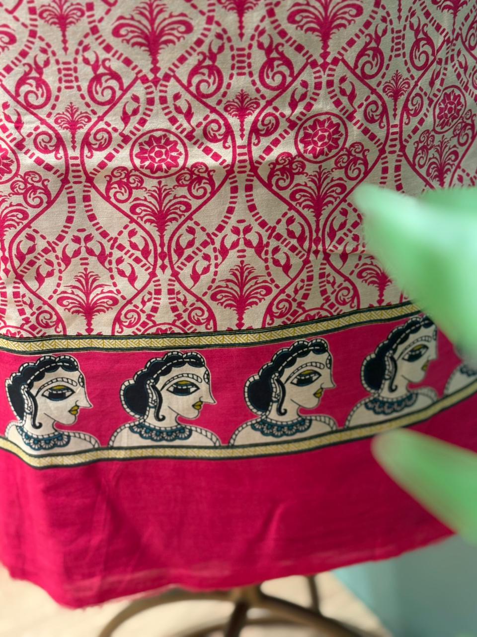 Celebrate timeless artistry with this beautiful unstitched Maheswari cotton suit set. The shirt features intricate Madhubani-inspired prints, reflecting traditional craftsmanship with a modern elegance. The rich detailing and fine patterns add depth and character, making it perfect for festive gatherings and cultural occasions. Paired with a stunning printed dupatta that enhances the overall look with bold borders and artistic motifs, this set is truly eye-catching. The bottom comes in soft santoon cotton fabric, ensuring comfort and a graceful fall after stitching. Style it your way and create a statement outfit that blends heritage, elegance, and everyday sophistication effortlessly. ✨