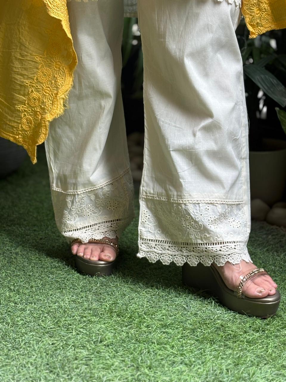 This beautiful Anarkali set in soft cotton fabric is a perfect blend of elegance and comfort. The shirt features intricate thread work with delicate chikankari and lace detailing, adding a graceful and refined touch. Paired with comfortable cotton pants, the outfit is completed with a stunning yellow and white contrast dupatta in soft mul  cotton fabric. Light, breathable, and effortlessly stylish, this set is ideal for festive days, casual gatherings, or daytime celebrations, offering a fresh and charming ethnic look. ✨
