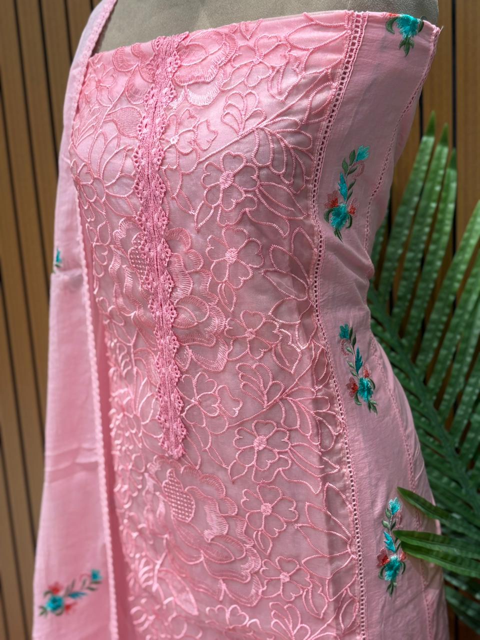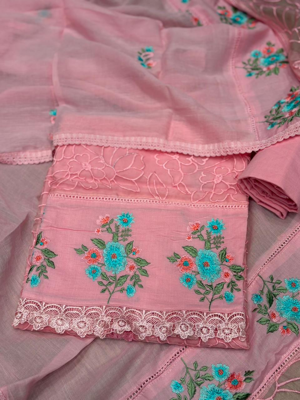 This elegant unstitched suit is crafted in soft and breathable mul cotton fabric, making it perfect for all-day comfort with a refined festive touch. The front panel is highlighted with delicate organza base work and intricate floral embroidery, adding a graceful and luxurious appeal. The dupatta comes in airy mul cotton, beautifully finished with organza base work on both sides for a rich, premium look. The bottom is in comfortable cotton fabric, ensuring easy movement and a perfect drape. Ideal for summer days, festive mornings, casual functions, and elegant daily wear. Available in three stunning shades – pistachio green, powder blue, and blush pink – each colour reflects timeless charm and sophistication.