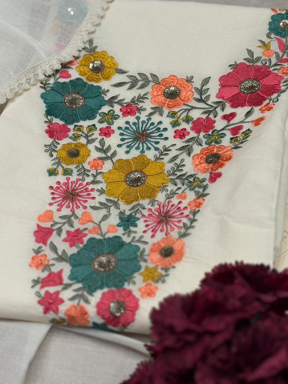 This elegant unstitched suit set is crafted in soft cotton fabric, featuring delicate thread floral embroidery beautifully highlighted on the neckline. The base remains a graceful ivory tone, while each piece is enhanced with different vibrant floral colour stories. Paired with a lightweight cotton dupatta and comfortable cotton bottom fabric, this suit offers the perfect balance of classy and everyday comfort. The intricate embroidery adds a fresh, feminine charm, making it ideal for gatherings, daytime events or elegant casual wear. A timeless piece for women who love subtle detailing with a modern ethnic touch. Available in three fresh colours