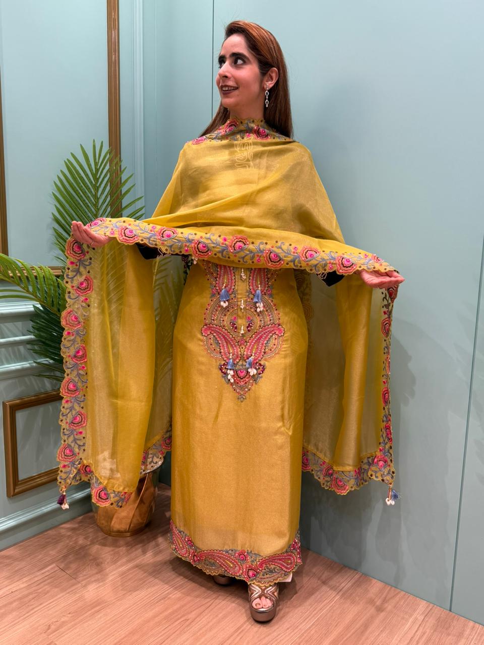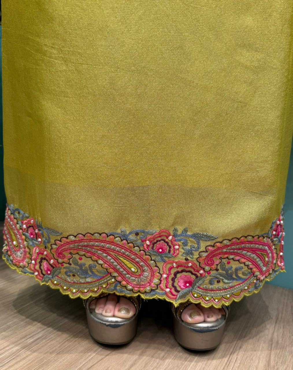 The Olive Mustard shade gives a warm, festive, and traditional appeal, ideal for day functions and haldi or mehndi ceremonies.
