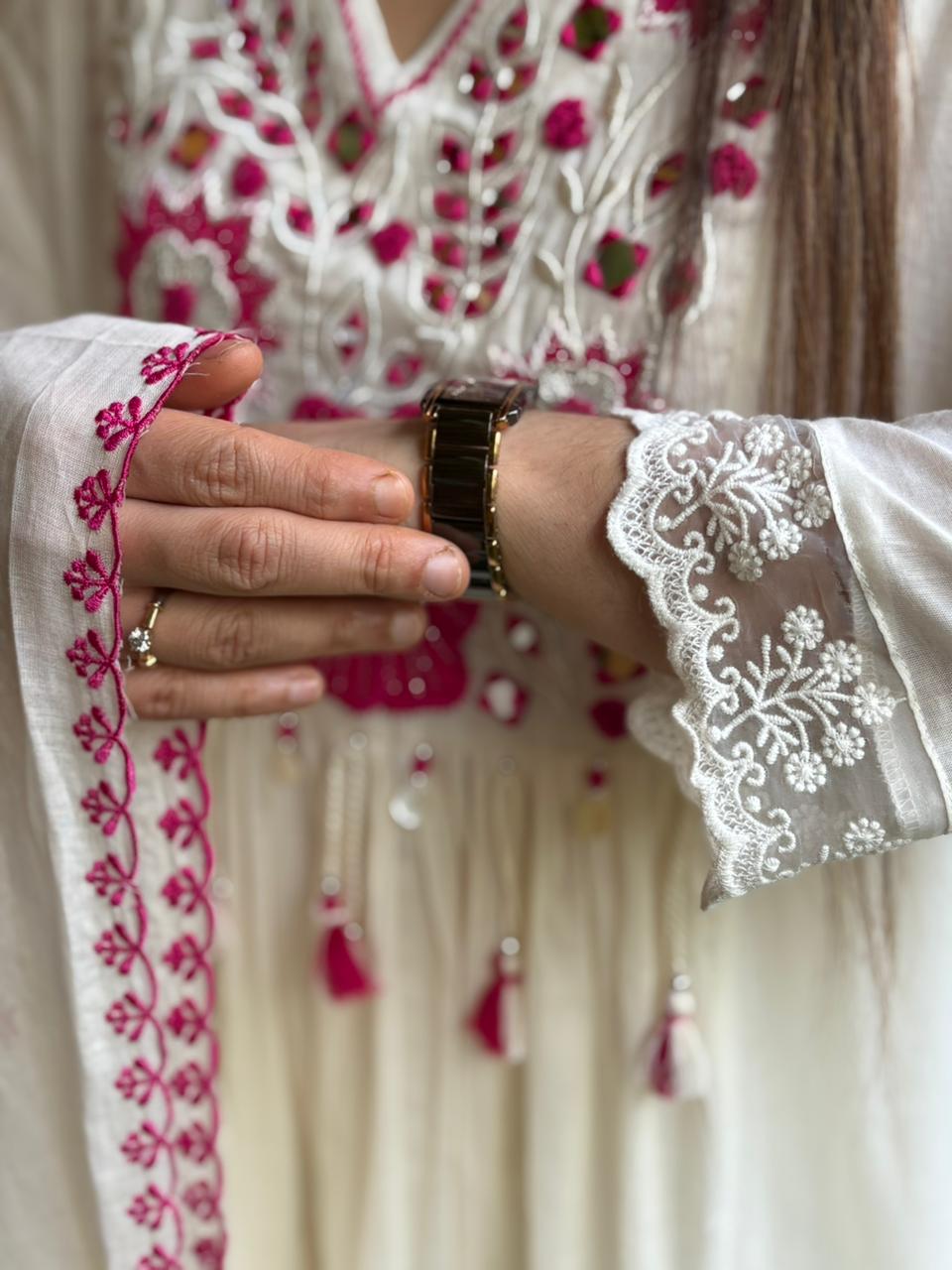 This beautiful mul cotton kurti set is designed for effortless elegance and comfort. The soft mul cotton fabric feels light and breathable, perfect for everyday wear and special gatherings. The neckline features delicate thread work with subtle mirror detailing, adding a graceful festive touch. It comes with a mul cotton dupatta adorned with elegant thread work on the border, enhancing the overall look. Paired with comfortable mul cotton pants, this outfit blends simplicity, tradition, and modern charm beautifully. A perfect choice for graceful ethnic style.
