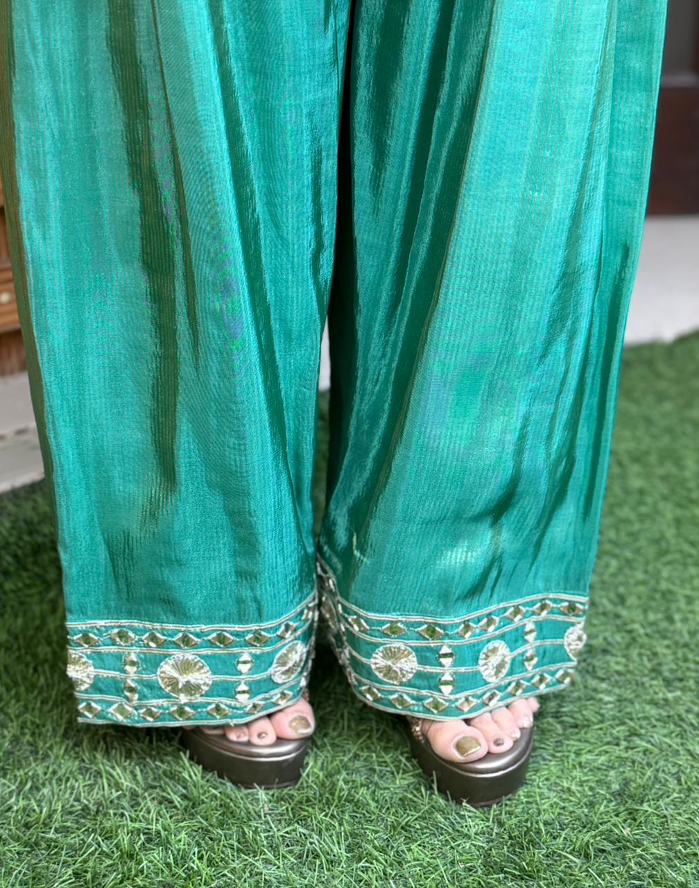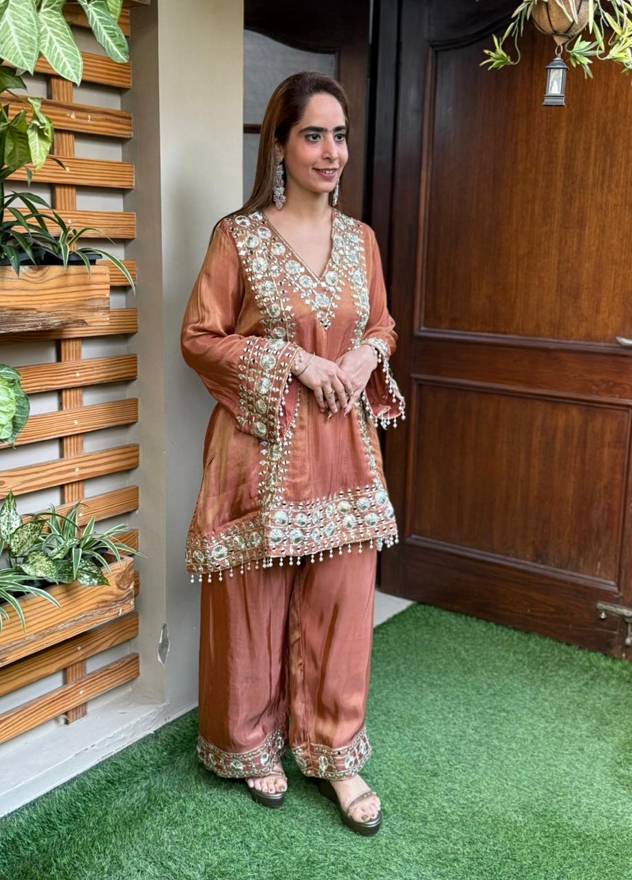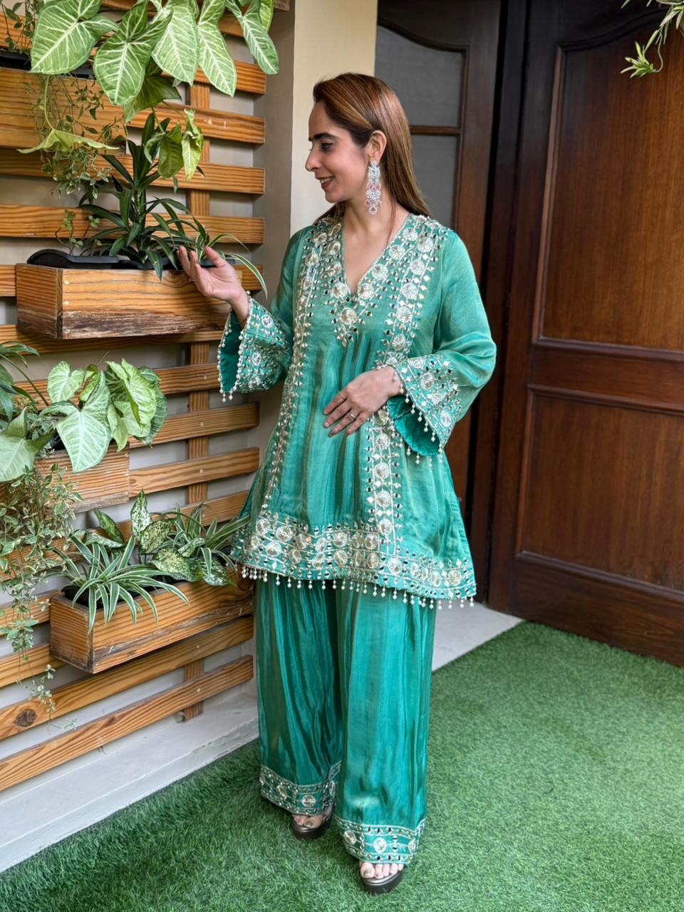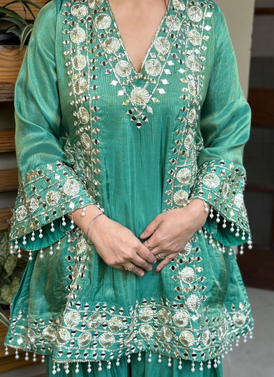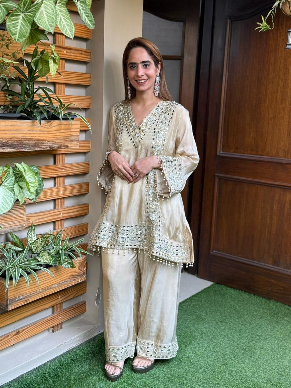 Introducing our short Anarkali with Farsi salwar, crafted in luxurious shimmer organza for that perfect festive glow.