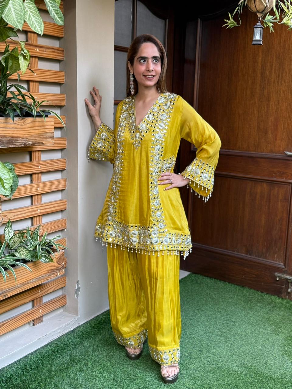 Adorned with intricate gota and mirror work, this silhouette blends tradition with modern elegance effortlessly. The flowy Anarkali paired with statement Farsi salwar creates a graceful yet stylish look—perfect for festive mornings, intimate weddings, and special celebrations.