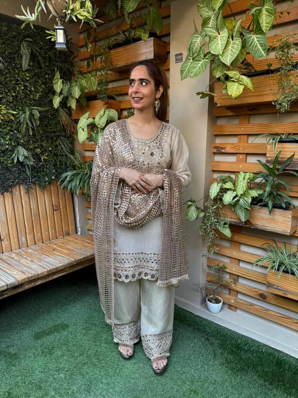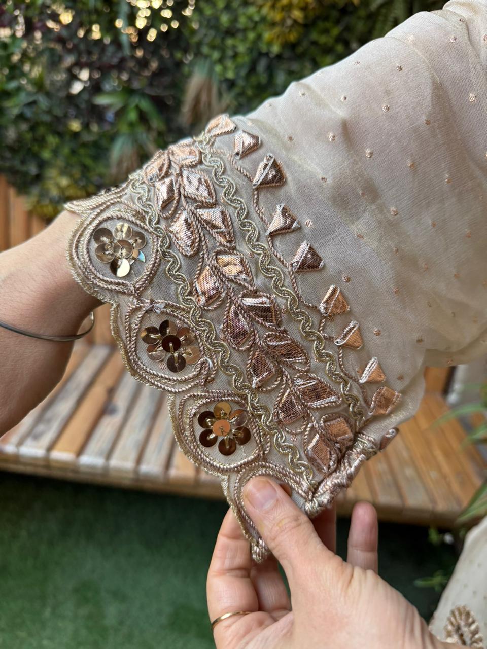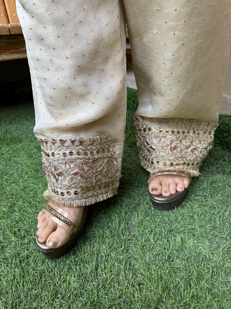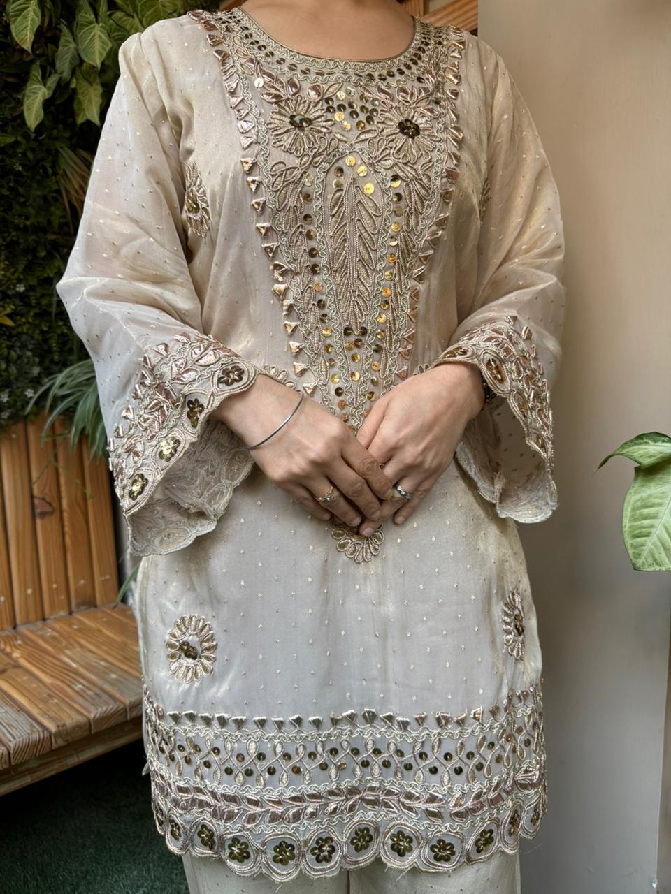 This stunning cord set from MeharbyShrimati is a perfect blend of grace, shimmer, and timeless craftsmanship. Crafted in luxurious shimmer organza fabric, this outfit instantly adds a soft glow and festive charm to your look. The kurta is beautifully highlighted with intricate gota work and delicate sequence detailing, giving it a rich yet refined appeal. Paired with perfectly tailored bottoms, the silhouette feels effortless, comfortable, and stylish for long celebrations.
