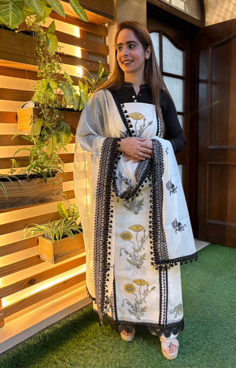 Crafted in soft breathable cotton fabric, this elegant unstitched suit is designed for effortless everyday grace. The shirt features beautiful floral prints with minimal yet classy detailing, keeping the look subtle and refined. The matching dupatta enhances the outfit with coordinated prints and delicate borders, adding a touch of sophistication without overpowering the design. Paired with a comfortable santoon bottom, this set ensures both style and ease. Available in three soothing shades – Ivory Pink, Ivory Blue, and Ivory Yellow – each color brings its own soft charm, perfect for daytime gatherings, casual outings, and graceful summer moments. Timeless, lightweight, and beautifully balanced. ✨