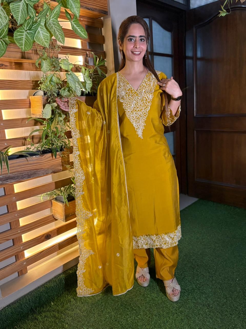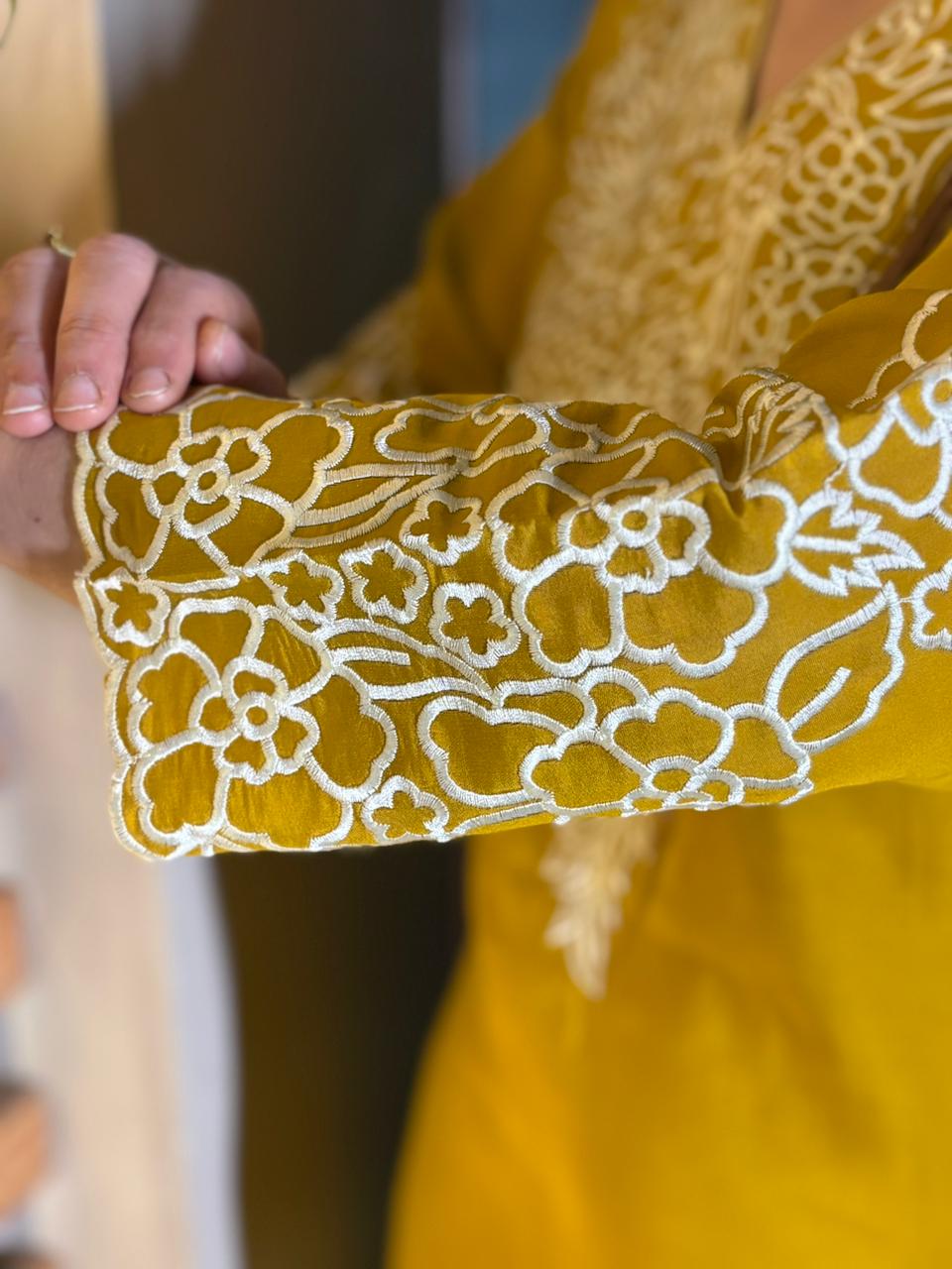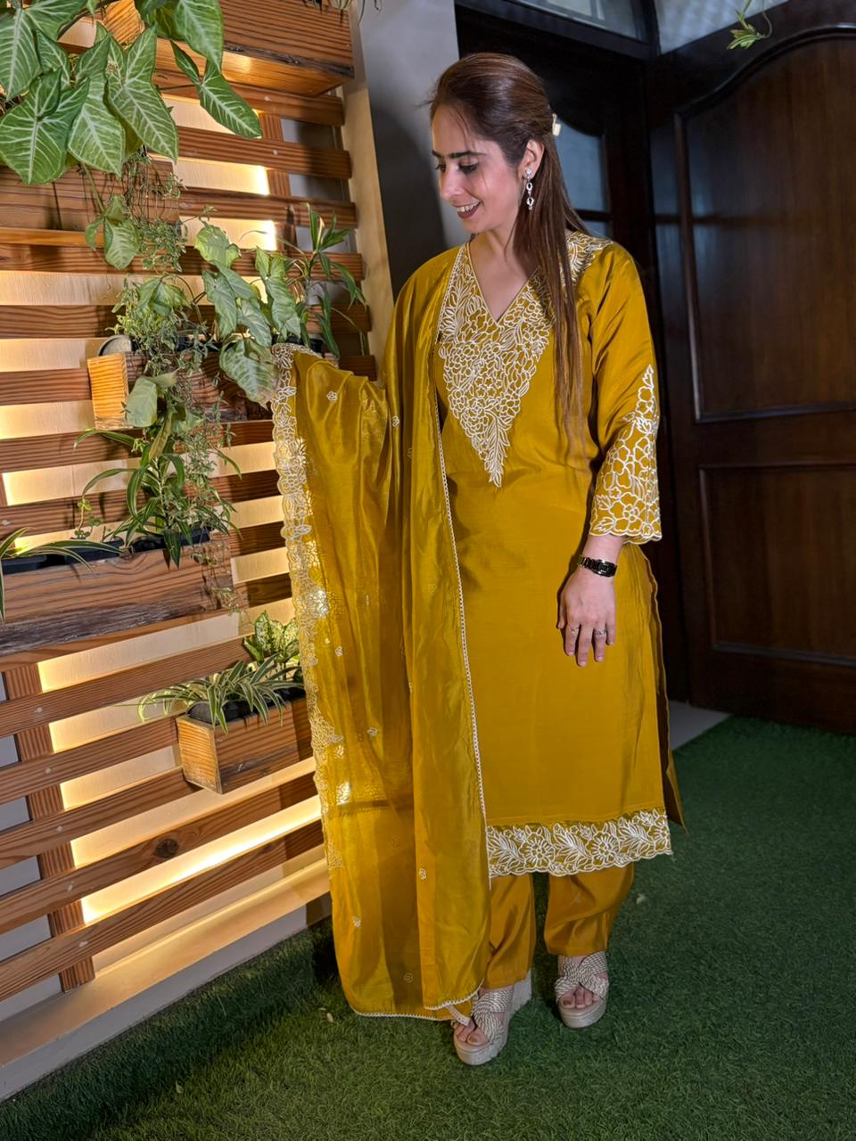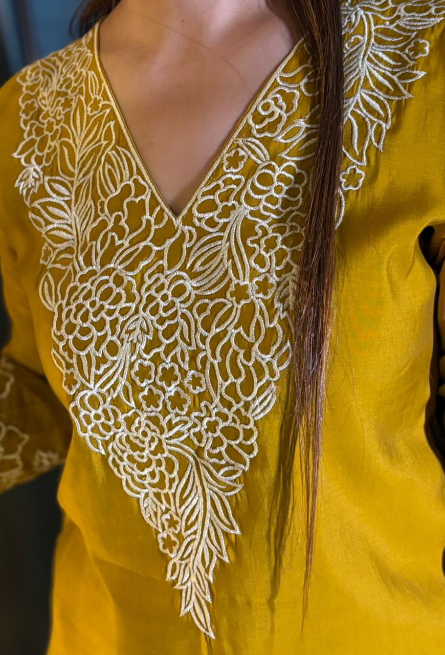 Step into effortless elegance with this beautifully designed muslin cotton kurti set, crafted for comfort and refined style. The soft, breathable fabric feels light on the skin, making it perfect for all-day wear. Intricate detailing on the shirt neckline and sleeves adds a graceful charm, while the matching dupatta with delicate cutwork borders enhances the overall look. The coordinated muslin cotton pants complete the ensemble with a polished finish. Available in two stunning shades — vibrant mustard yellow and rich deep teal — this set blends sophistication with modern simplicity. A timeless outfit for festive gatherings, casual outings, or intimate celebrations. ✨