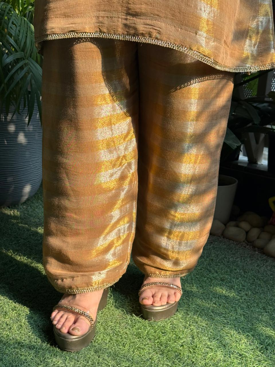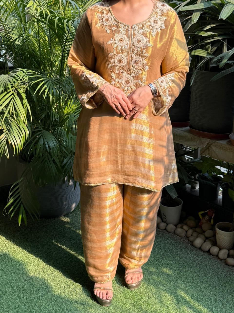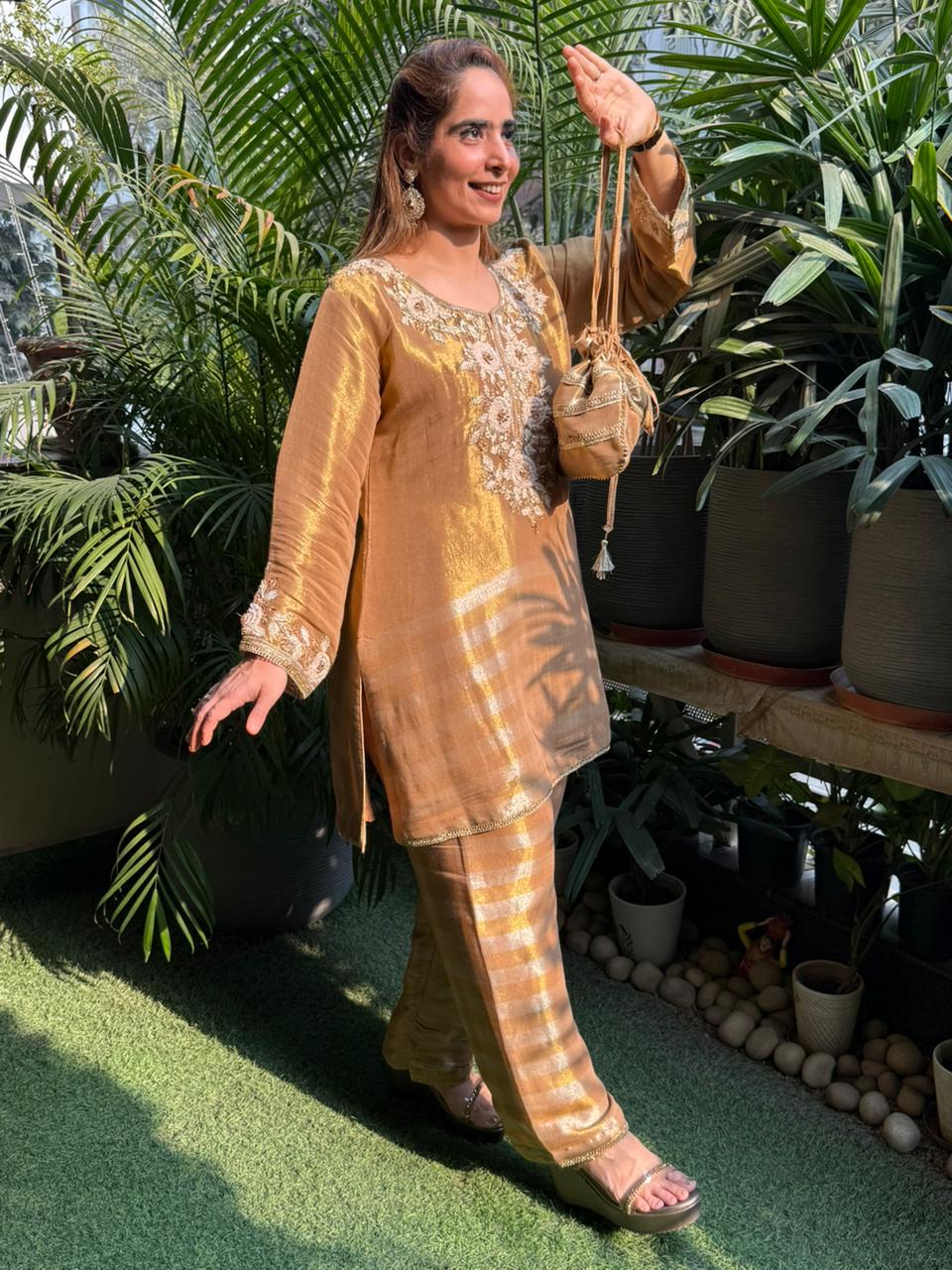 This elegant cord set crafted in luxurious tissue silk fabric is a perfect blend of grace and comfort. The subtle shimmer adds a festive glow, while the intricate hand detailing on the neckline and sleeves elevates the overall look with a touch of royalty. Designed for effortless styling, this set is ideal for festive gatherings, daytime celebrations, and elegant evenings. Paired with a beautifully coordinated potli, it completes the look with traditional charm and modern finesse. A timeless ensemble that reflects understated luxury, refined craftsmanship, and effortless elegance—perfect for women who love classic silhouettes with a contemporary feel. ✨
