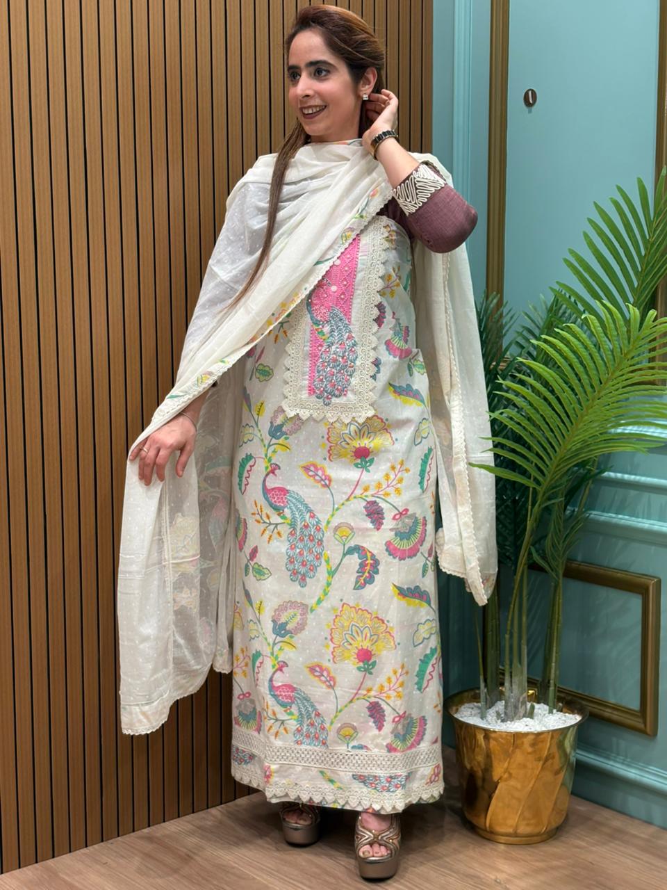 This elegant unstitched cotton suit fabric is designed for effortless everyday comfort with a touch of refined detailing. The soft cotton kurta fabric features graceful all-over prints that feel light, breathable, and perfect for warm weather. The neckline is beautifully finished with delicate lace detailing, adding a subtle charm and enhancing the overall look. The matching cotton dupatta complements the suit with coordinated prints and a flowy, airy drape. Completed with a comfortable cotton bottom fabric, this suit set offers ease of movement and timeless style—ideal for office wear, daily outings, casual gatherings, and relaxed festive moments.