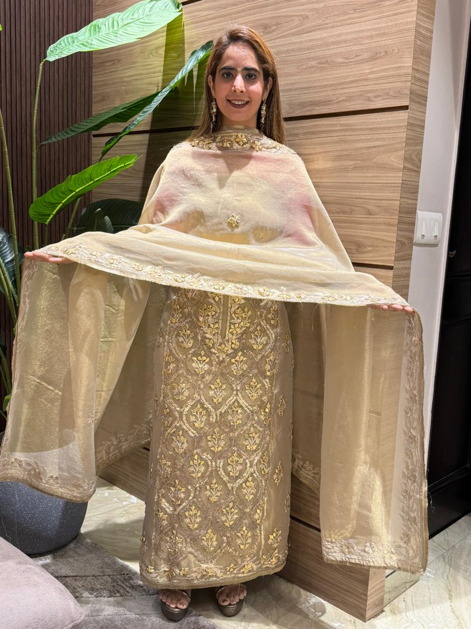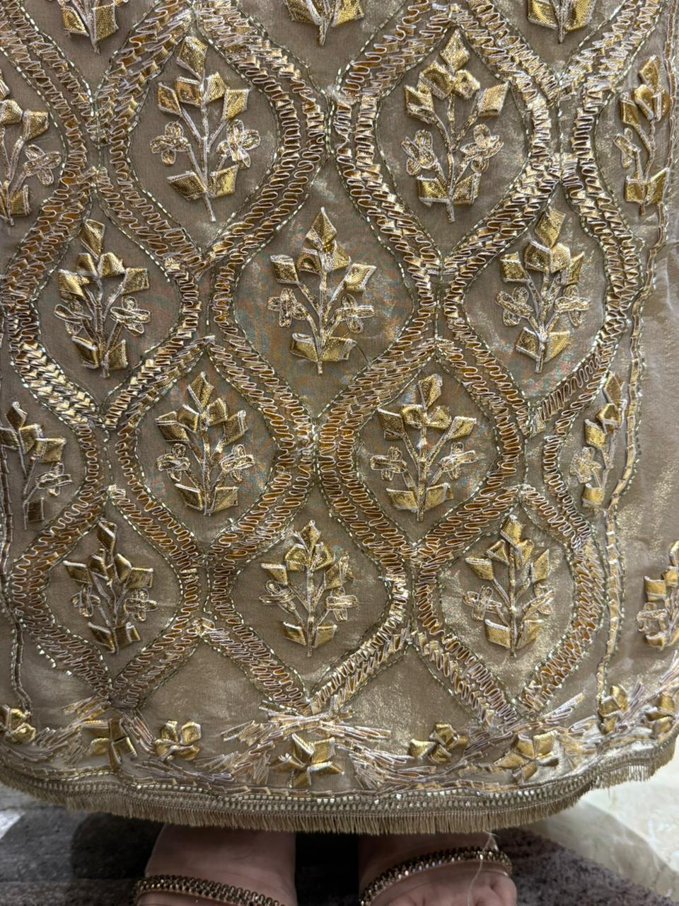This elegant unstitched fabric suit set is crafted for those who love timeless luxury with refined detailing. The suit is made in rich shimmer organza fabric, beautifully enhanced with intricate Gota and zari work, creating a graceful festive appeal. The delicate embroidery adds subtle shine, making it ideal for weddings, festivities, and special occasions.