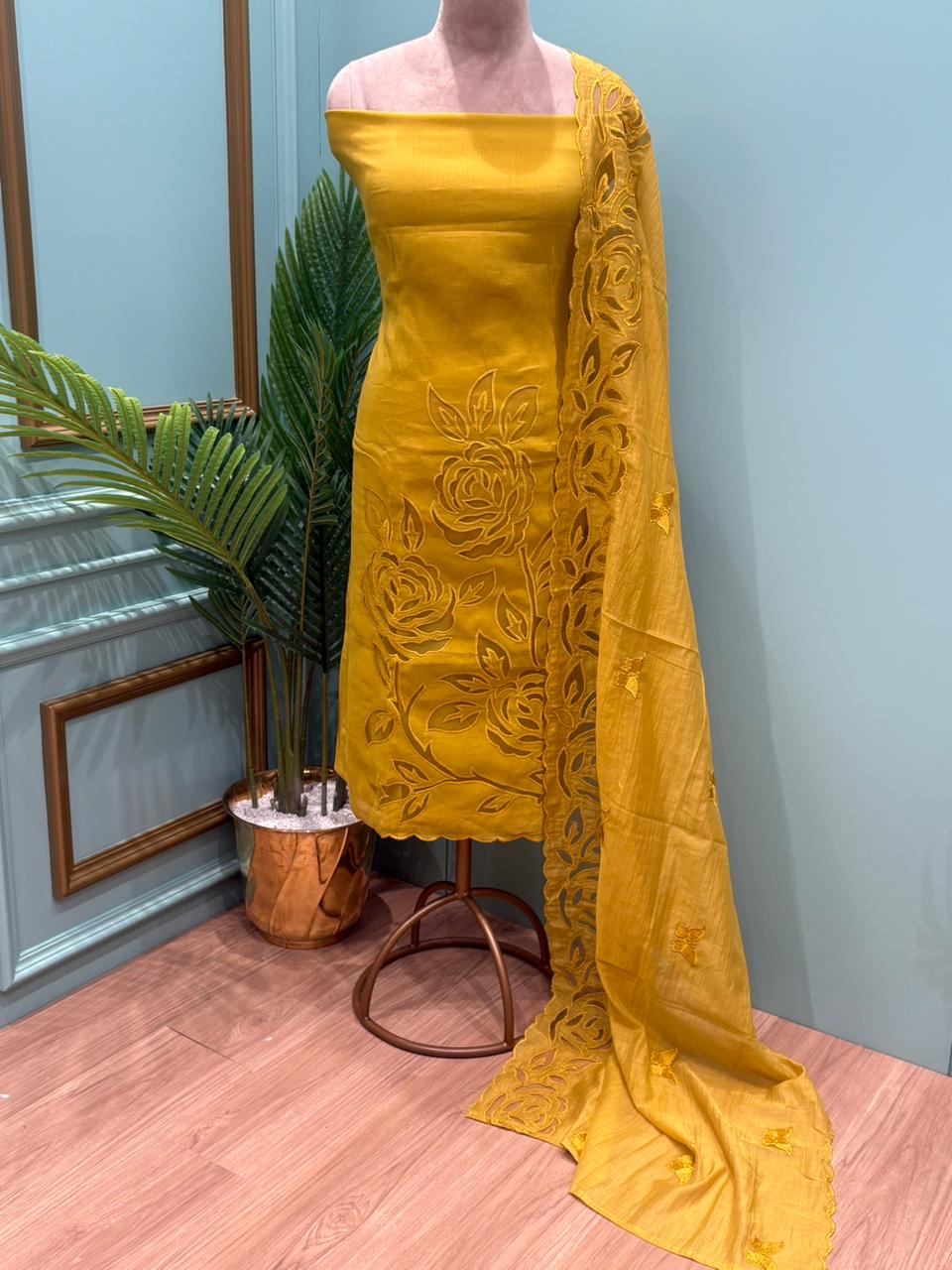 This elegant unstitched suit is crafted in premium muslin cotton, offering a soft, breathable, and luxurious feel. The shirt features intricate cut work detailing that enhances its graceful and artistic appeal. The matching dupatta complements the design beautifully, adding flow and sophistication to the ensemble. Paired with a comfortable santoon cotton bottom, it ensures ease and structure for everyday elegance. Available in three stunning shades – Regal Ruby, Deep Teal, and Mustard Gold – each colour reflects its own unique charm. Perfect for refined daywear, casual gatherings, or graceful occasions, this suit blends tradition, comfort, and timeless style effortlessly.