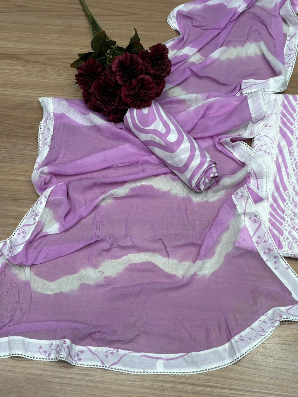 This elegant unstitched suit set is crafted from soft and breathable cotton fabric, perfect for comfortable everyday elegance. The shirt features a beautiful delicate print that adds a graceful charm to the outfit, while the neckline is enhanced with intricate detailing for a refined touch. The set is paired with a lightweight chiffon dupatta designed with a stylish four-side border, giving the ensemble a graceful and flowing look. Completing the set is a cotton bottom with subtle matching print that perfectly balances the design. This outfit beautifully blends comfort, simplicity, and timeless ethnic style, making it ideal for day outings, casual gatherings, and festive moments.