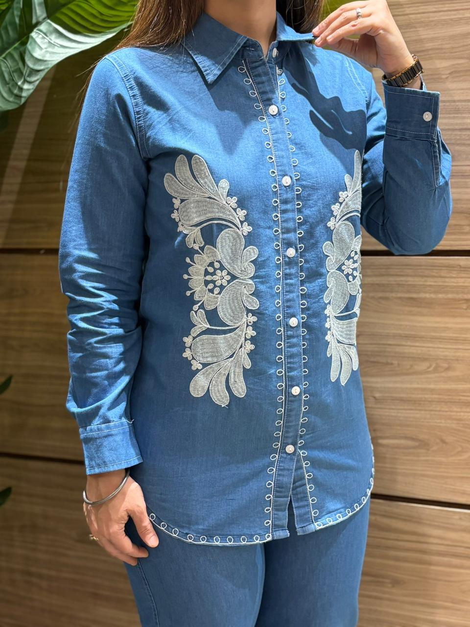 Elevate your everyday style with this chic denim cord set, designed for effortless sophistication. Crafted in premium denim fabric, the shirt features beautiful embroidery that adds a refined, statement touch. The structured yet comfortable denim pants complete the look perfectly, making it ideal for casual outings, brunch dates, or travel days. Stylish, versatile, and easy to carry, this set blends modern elegance with all-day comfort—your go-to outfit for a smart and polished vibe.