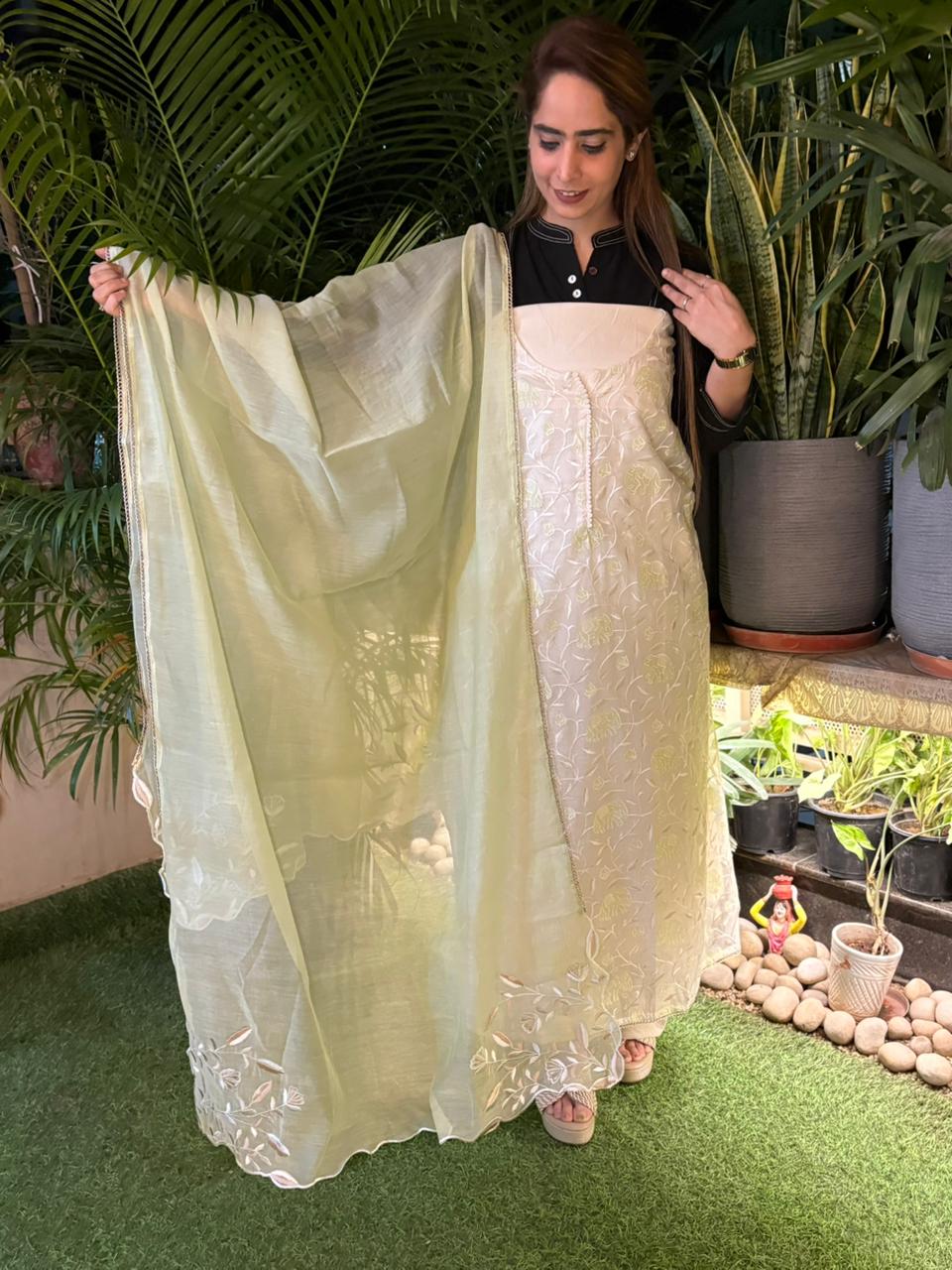 Experience effortless elegance with our beautifully designed unstitched suit crafted in pure mul cotton fabric. The shirt features delicate detailing that enhances its graceful appeal, while the matching mul cotton dupatta adds softness, lightness, and fluid movement. Paired with comfortable santoon cotton bottom fabric, this ensemble ensures breathability and all-day comfort. Perfect for everyday sophistication, casual outings, or refined daywear styling. Its timeless charm and minimal yet elegant design make it a versatile wardrobe essential. Available in three refreshing shades—Lilac Bloom, Pistachio Mist, and Ivory Lemon—each offering a unique expression of subtle luxury and modern grace. Perfect choice for effortless seasonal styling.