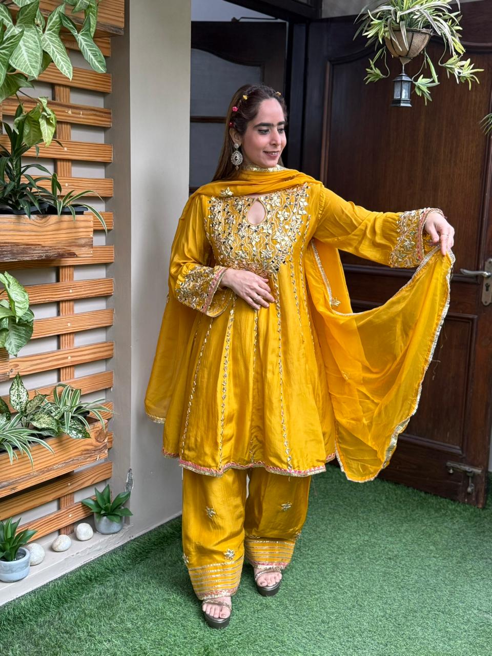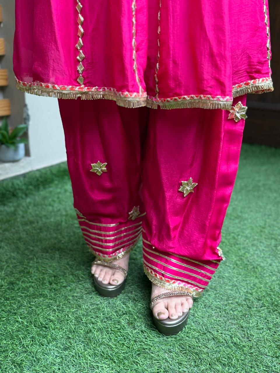 This exquisite short Anarkali set is beautifully crafted in luxurious Upada silk fabric, known for its rich texture and graceful fall. The Anarkali is adorned with intricate gota and lace work, adding a touch of traditional charm and festive elegance to the silhouette. Paired with a soft, sheer organza dupatta, this ensemble creates a perfect balance of richness and lightness, while the comfortable matching salwar ensures effortless wear throughout the day. Ideal for festive celebrations, family functions, intimate weddings, and special occasions, this outfit exudes timeless elegance. Available in four stunning shades – Magenta Pink, Yellow, Blue, and Purple, each colour brings its own vibrant and graceful appeal, making this Anarkali a standout choice for every ethnic wardrobe ✨💫
