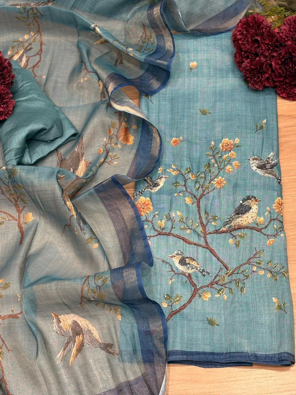 Exquisite unstitched suit is crafted in soft and breathable linen cotton