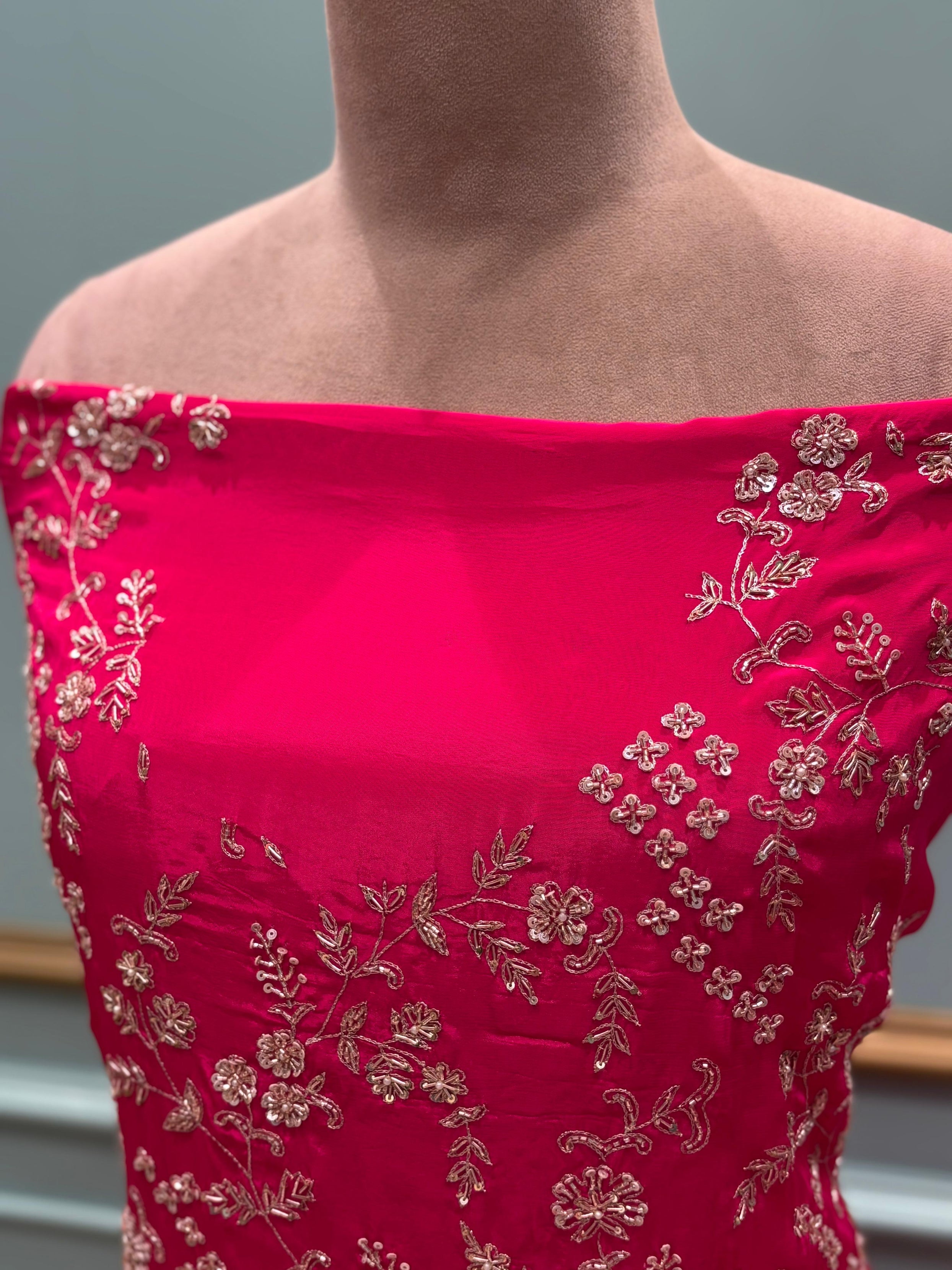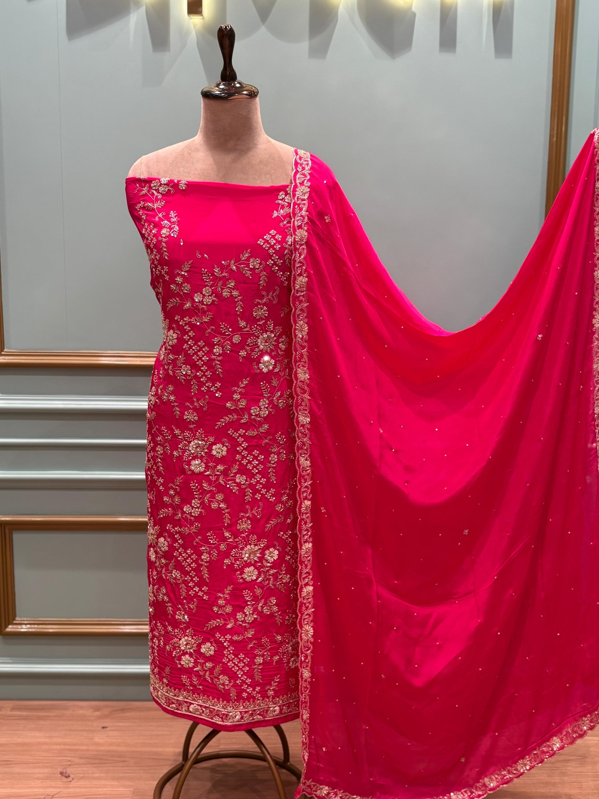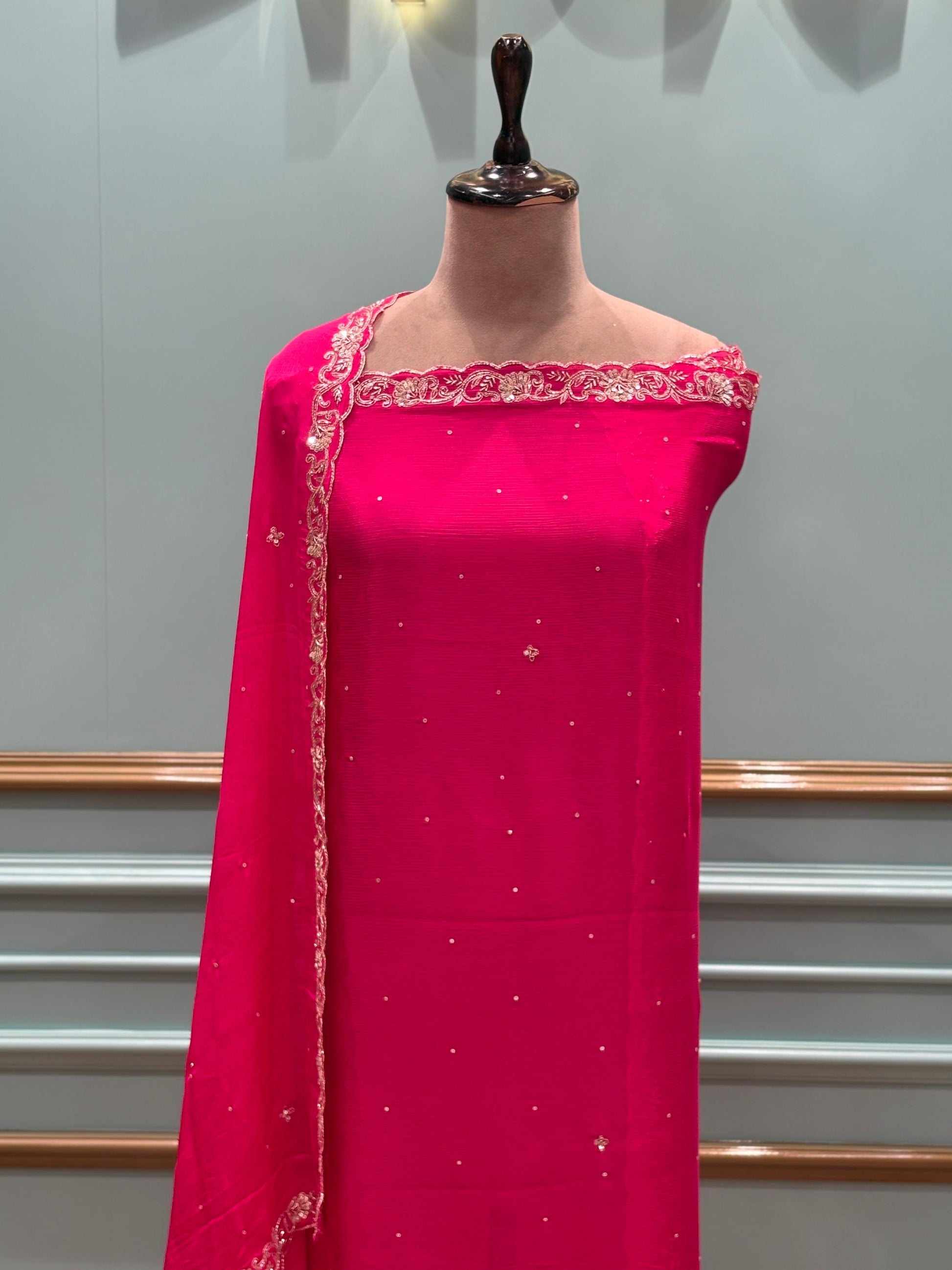 Grace your festive and wedding occasions with this stunning Crape silk suit set. The kurta is finely adorned with sequins, katdana, dapka, and pearl work, adding a touch of brilliance and tradition to the ensemble. Paired with a smooth and elegant Crape silk bottom, it blends style with comfort. The highlight of the set is the Chinon dupatta, enriched with sequins highlights, katdana, dapka, and pearl embellishments, making it a true statement piece. Perfect for celebrations, this attire radiates luxury and timeless charm, making you stand out gracefully. A signature creation from Mehar by Shrimati.