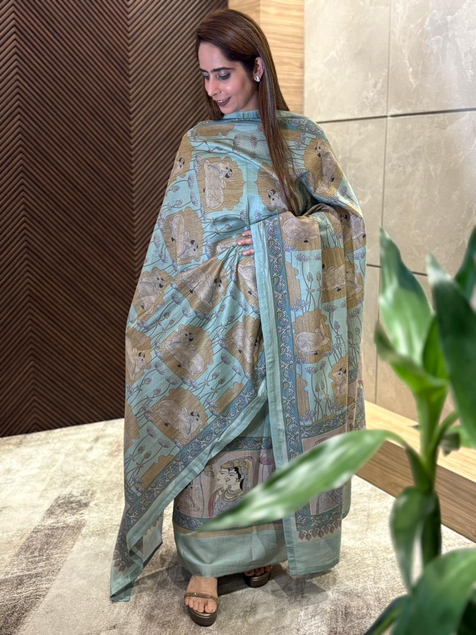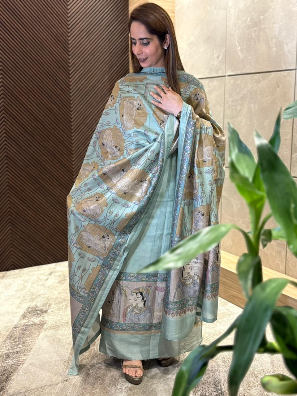 Grace meets heritage in this beautiful Maheshwari cotton unstitched suit, designed for timeless elegance. The shirt and dupatta showcase traditional figure art prints that reflect classic Indian craftsmanship with a modern touch. Soft, breathable fabric ensures all-day comfort, making it perfect for festive gatherings and graceful day functions. Paired with santoon cotton bottom, this ensemble blends style and ease effortlessly. A perfect choice for those who love subtle luxury with artistic detailing in every drape.