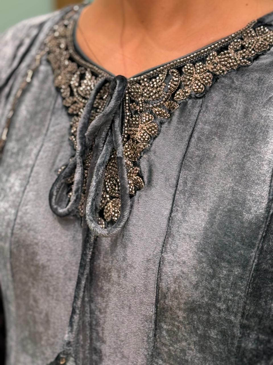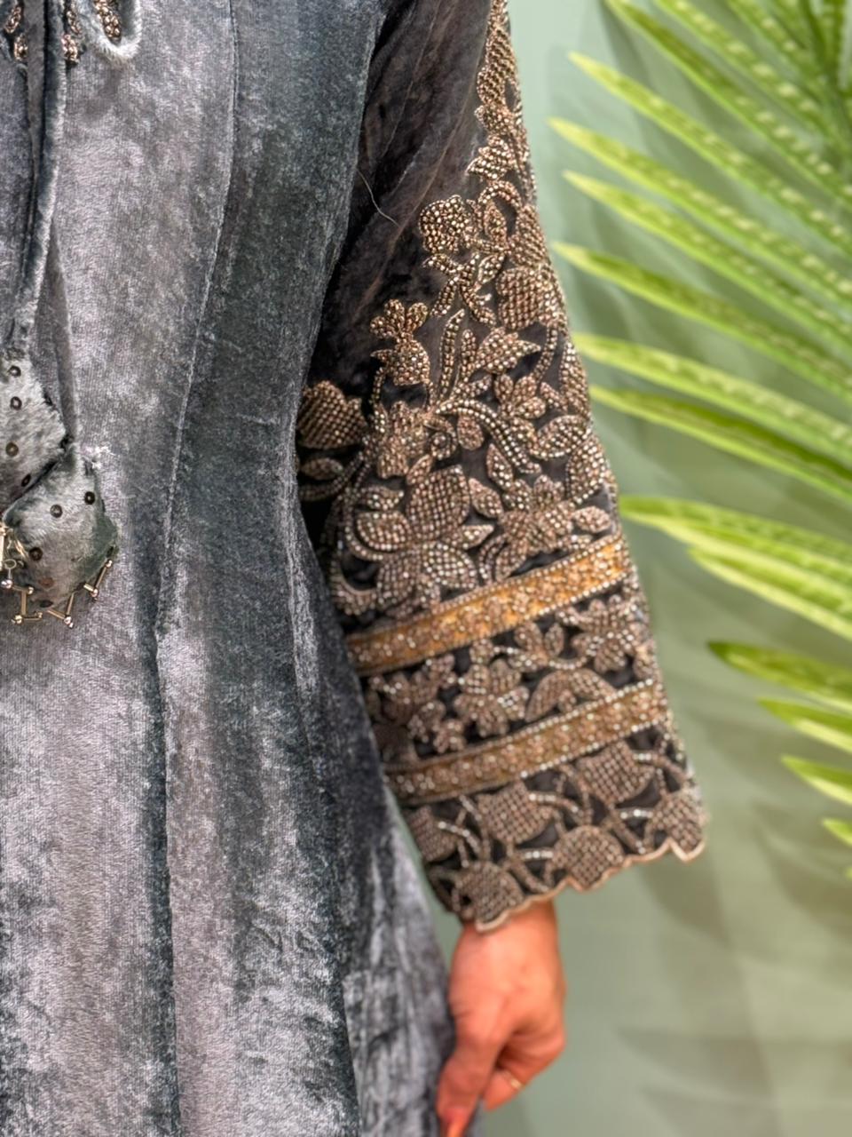 Indulge in pure elegance with our luxury velvet long Anarkali, crafted for the modern diva. Featuring intricate heavy handwork, this regal ensemble comes with a rich velvet dupatta and matching velvet bottoms adorned with detailed border work. Available in two timeless shades — Charcoal Grey for understated glamour and Deep Wine Red for royal charm. Perfect for weddings, festive soirées, and grand celebrations, this Anarkali blends classic craftsmanship with trending couture vibes. A statement outfit designed to make every entrance unforgettable. ✨