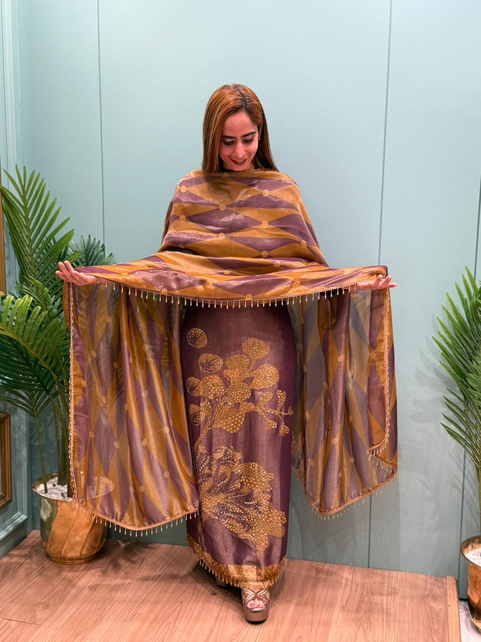 Organza Shimmer Unstitched Suit featuring all-over mirror work