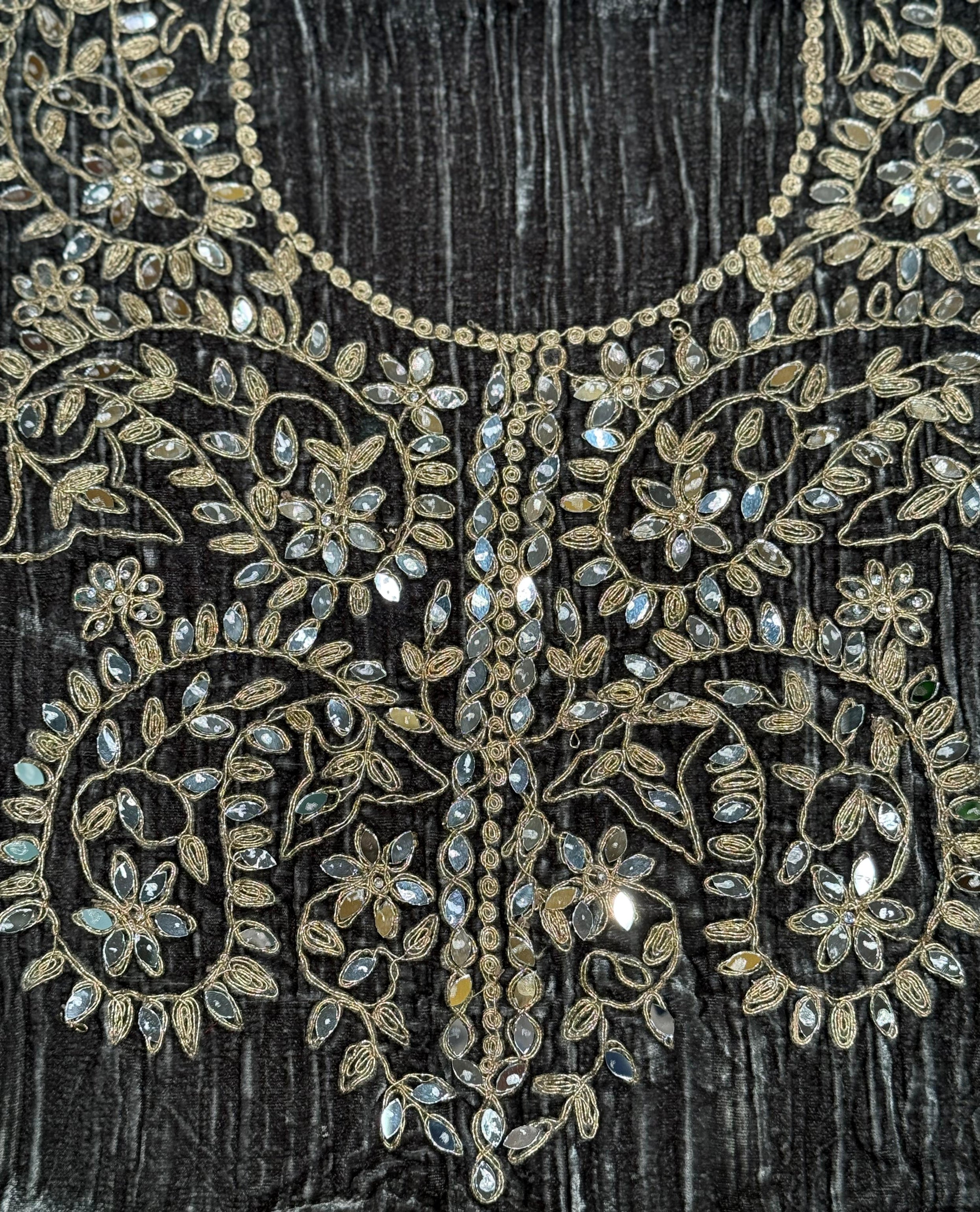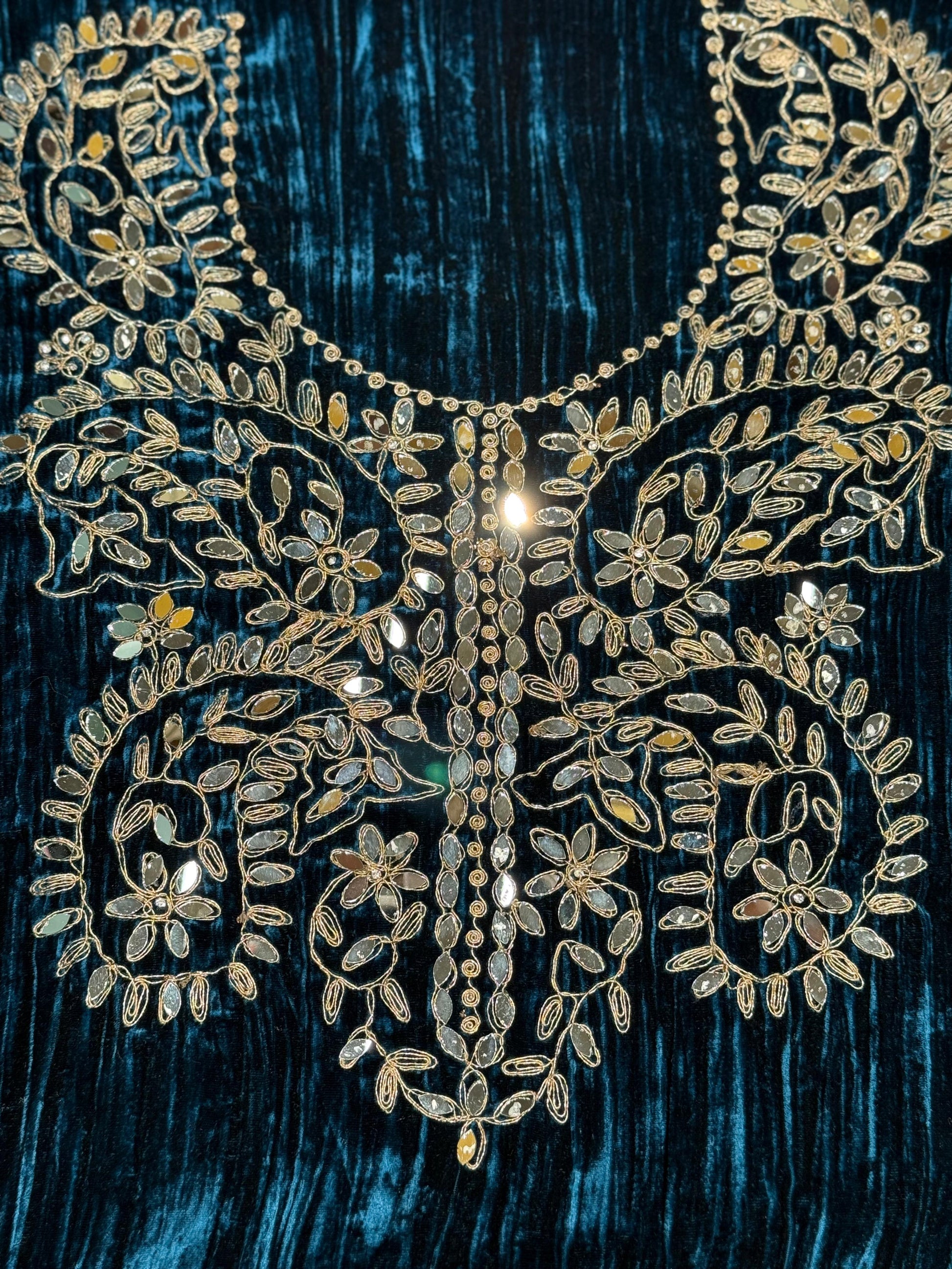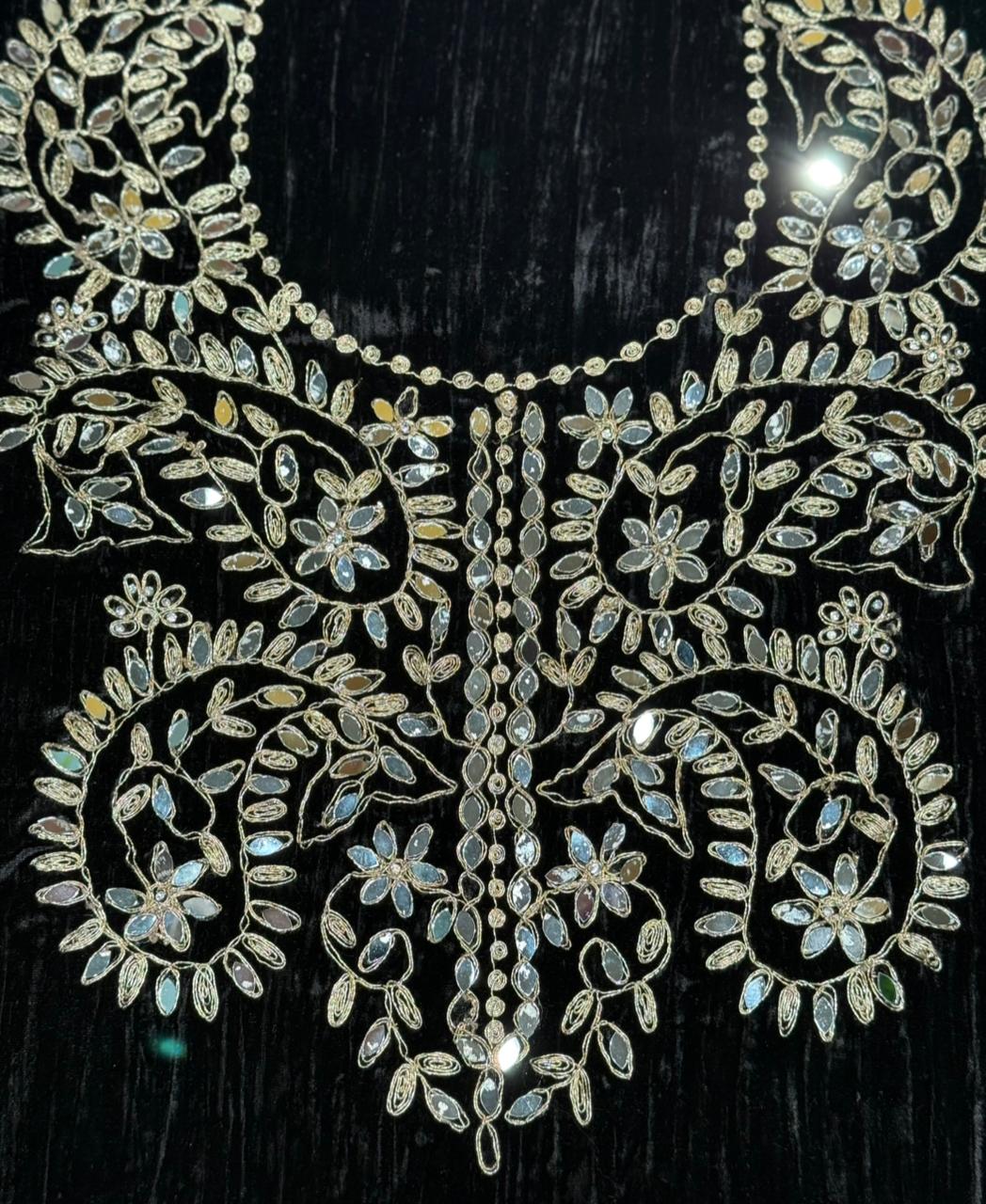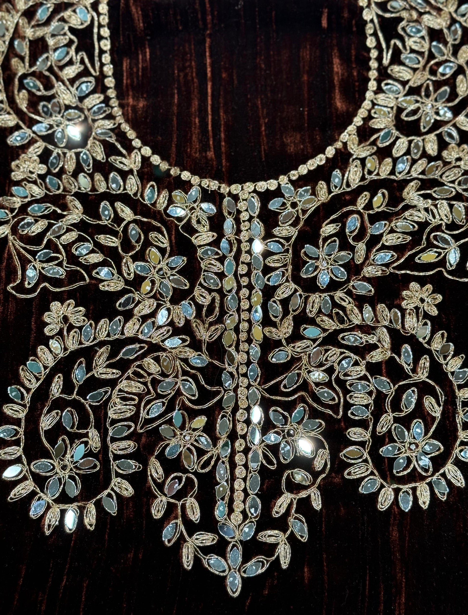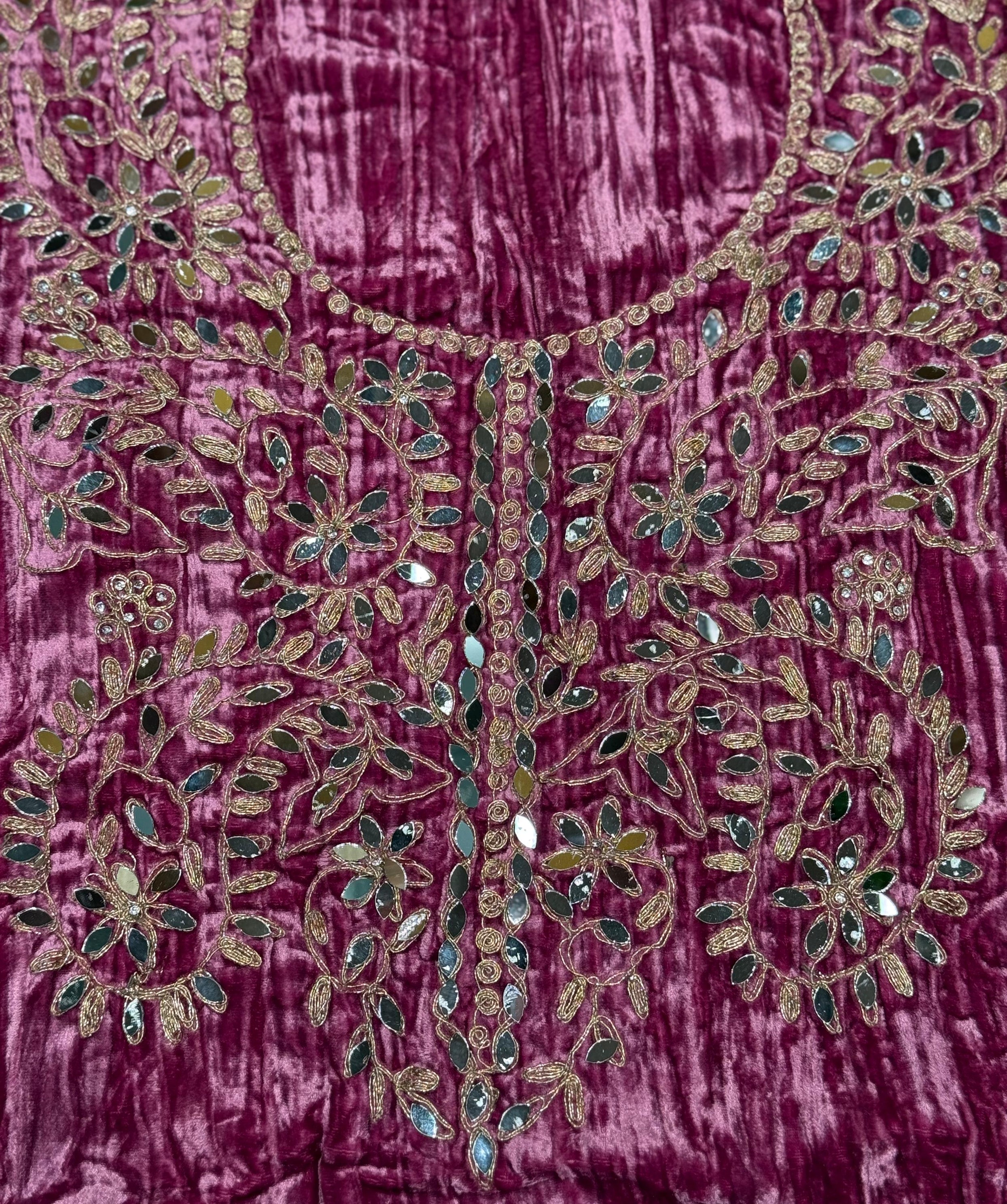 Step into royal elegance with our Crush Velvet Unstitched Suit Collection β fully hand-embroidered with heavy mirror work that sparkles with every move. π« The velvet dupatta comes with a stunning mirror cutwork border, while the bottom fabric also features intricate mirror detailing for that luxe finish. Perfect for winter weddings and festive nights β rich, regal, and effortlessly comfortable. Available in 6 mesmerizing shades β Brown, Black, Grey, Onion Pink, Bottle Green, and Teal Blue.