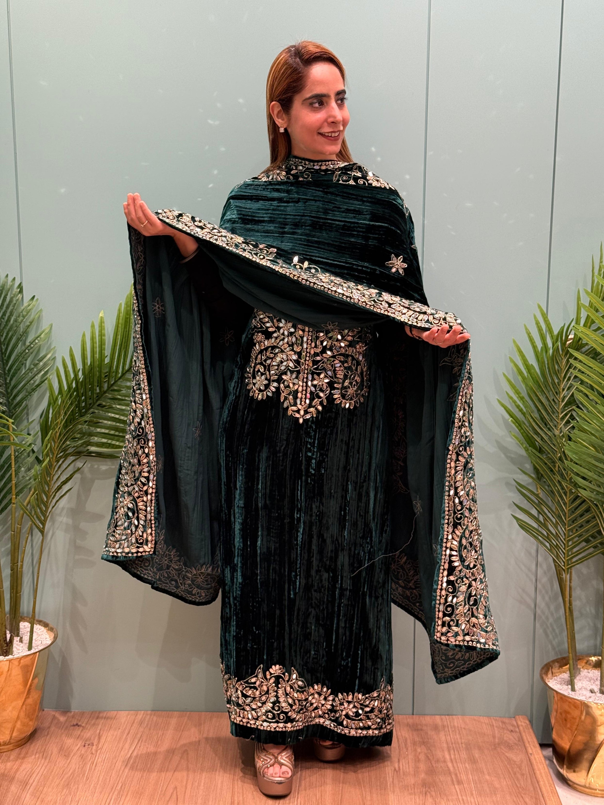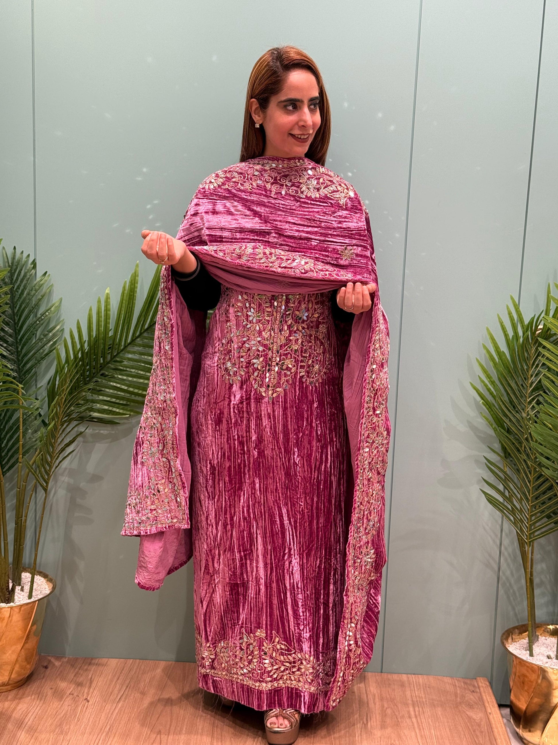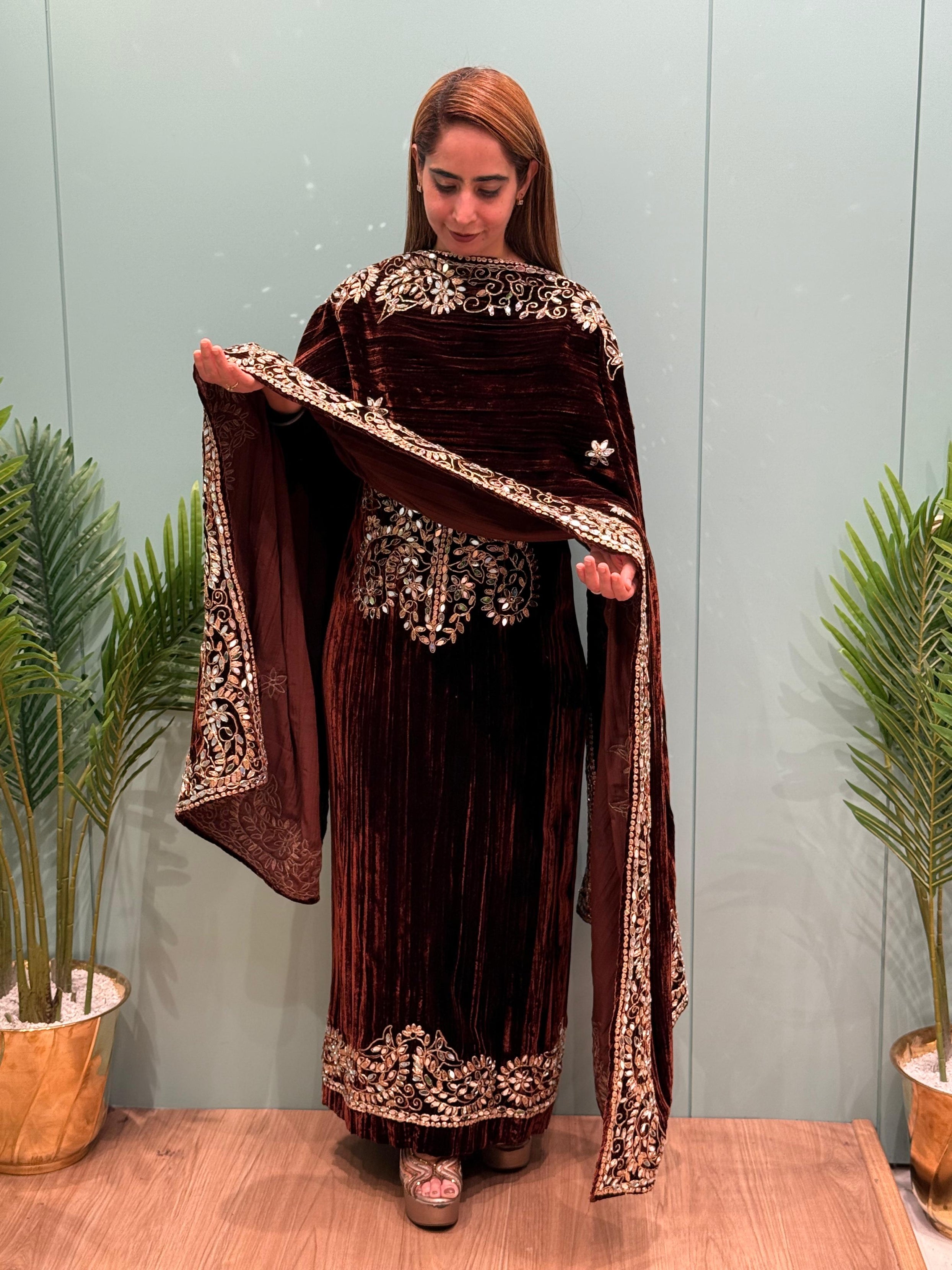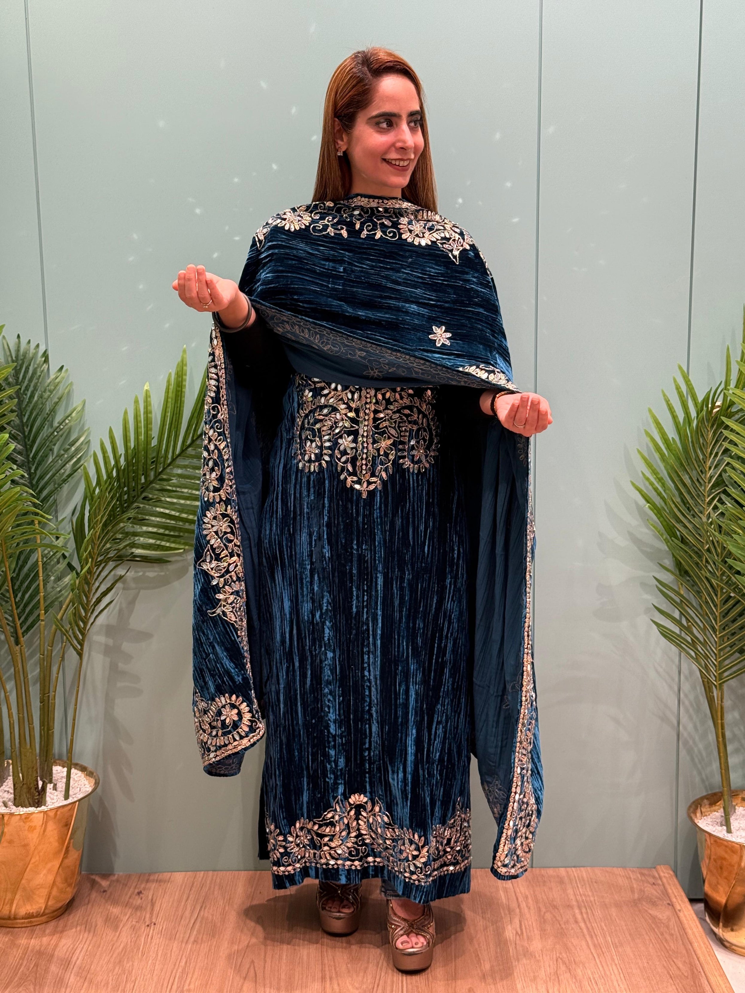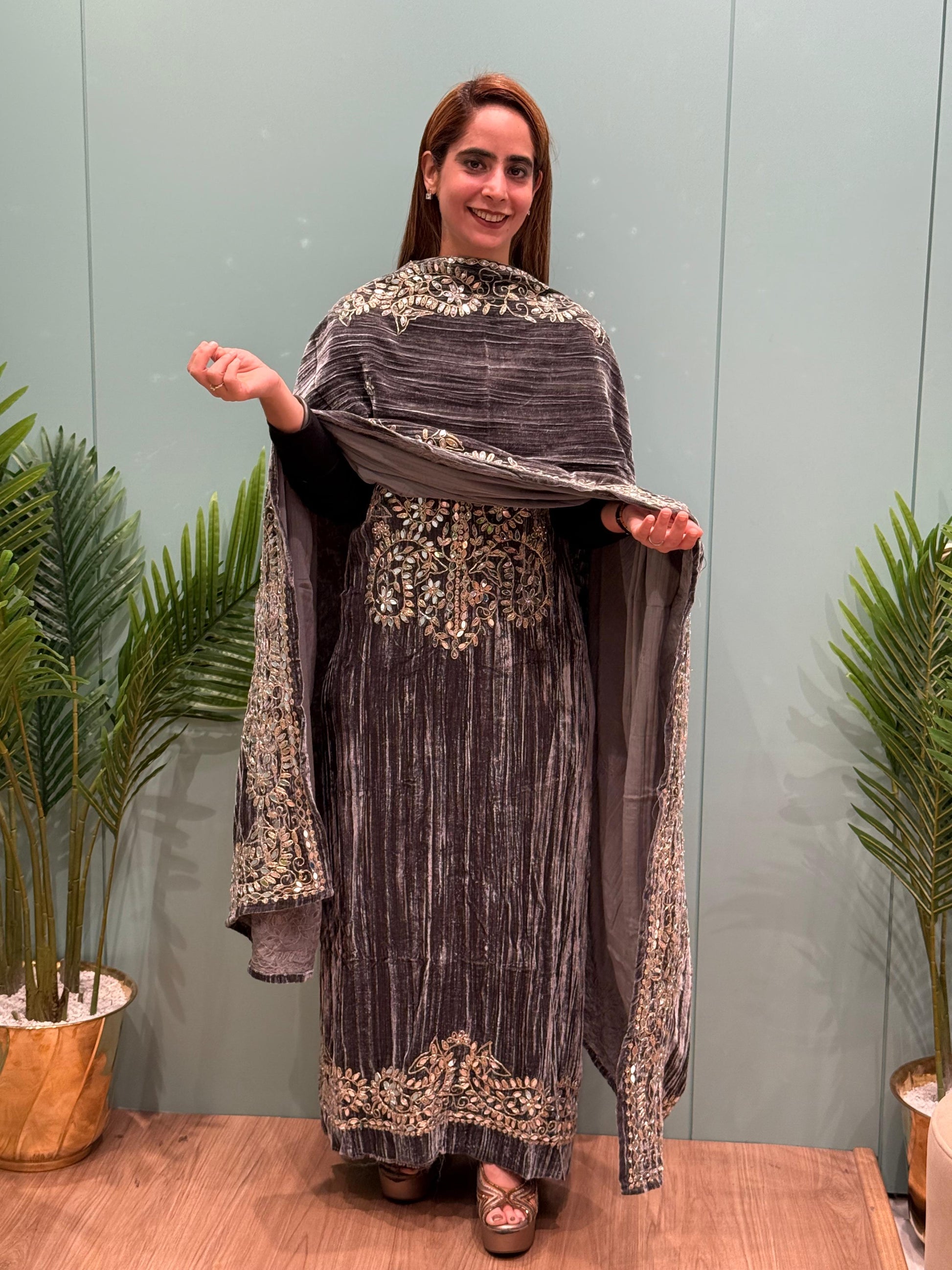 Step into royal elegance with our Crush Velvet Unstitched Suit Collection β fully hand-embroidered with heavy mirror work that sparkles with every move. π« The velvet dupatta comes with a stunning mirror cutwork border, while the bottom fabric also features intricate mirror detailing for that luxe finish. Perfect for winter weddings and festive nights β rich, regal, and effortlessly comfortable. Available in 6 mesmerizing shades β Brown, Black, Grey, Onion Pink, Bottle Green, and Teal Blue.