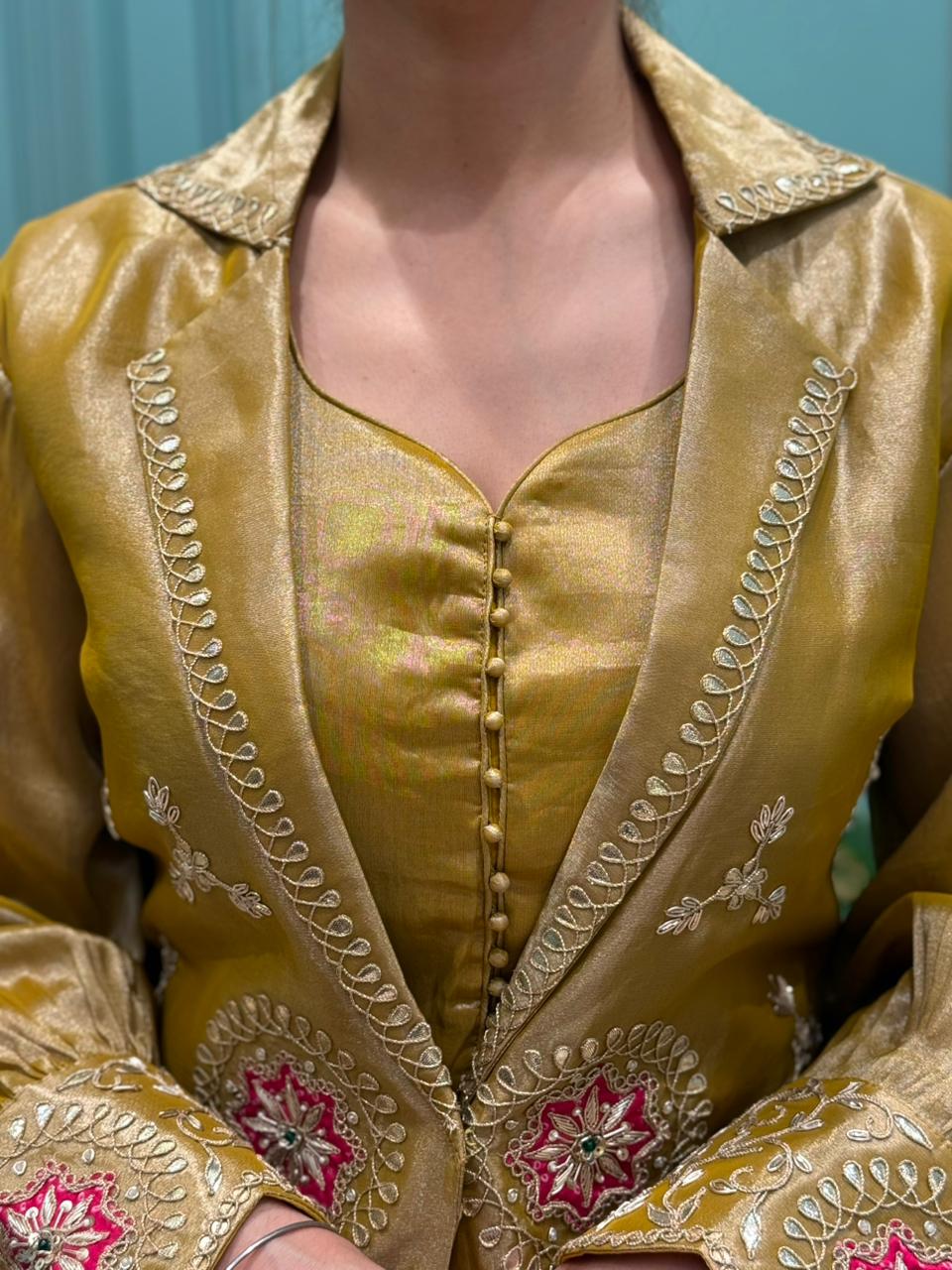 A stunning combo of crop top, jacket & fully flared palazzo in luxe shimmer organza. Detailed with gota & zari work and elegant dapka highlights, this outfit is perfect for festive and wedding vibes. Bold, stylish, and effortlessly glamorous. 💫